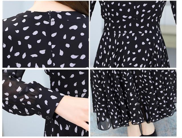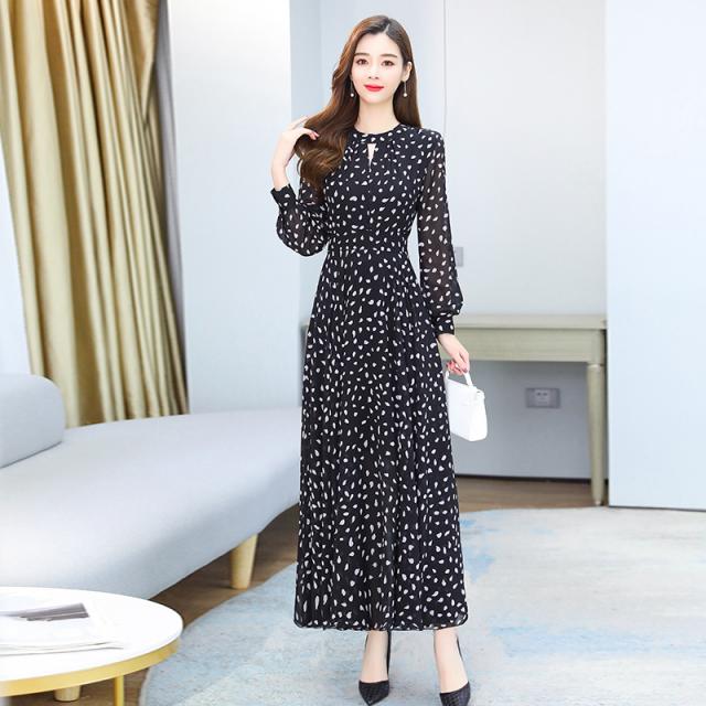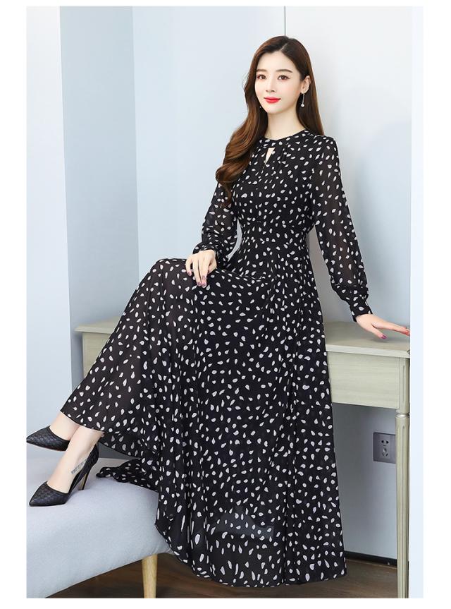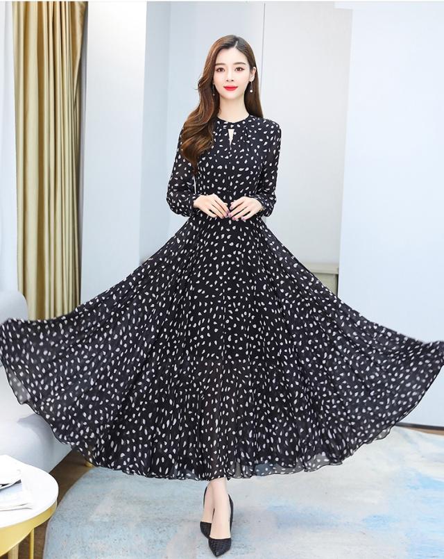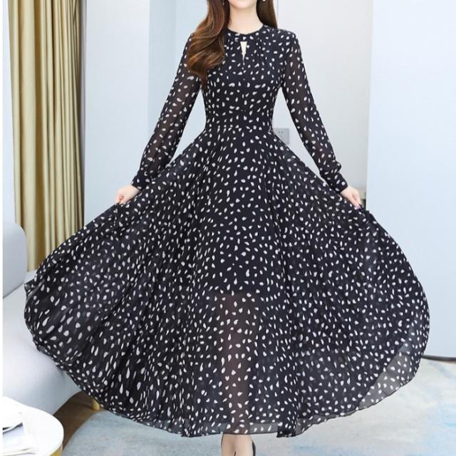 ドット シャーリング ワンピース フレアワンピース ロング ロング丈 マキシ マキシ丈 アンクル丈 袖あり 長袖 パフスリーブ Uネック フレア プリーツ シフォン スリット 透け感 シースルー かわいい 大人可愛い きれいめ カジュアル 大人 上品 おしゃれ 大人女子 ラブリー