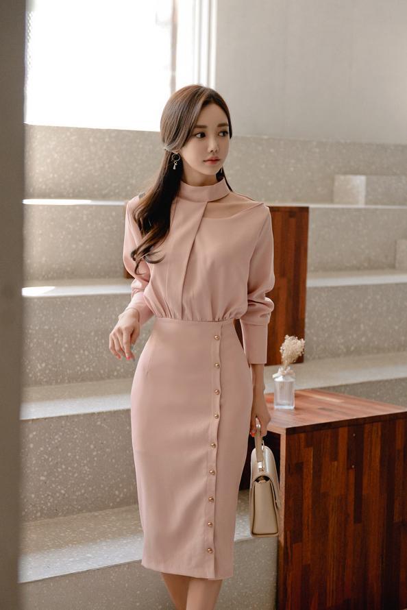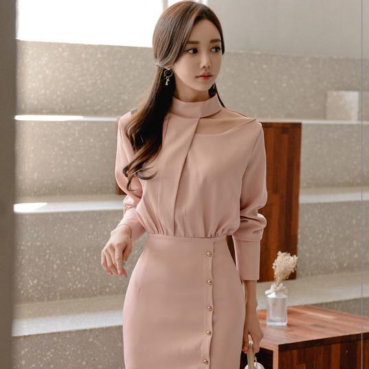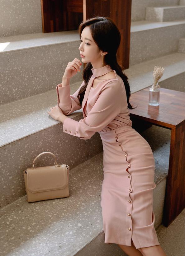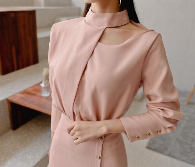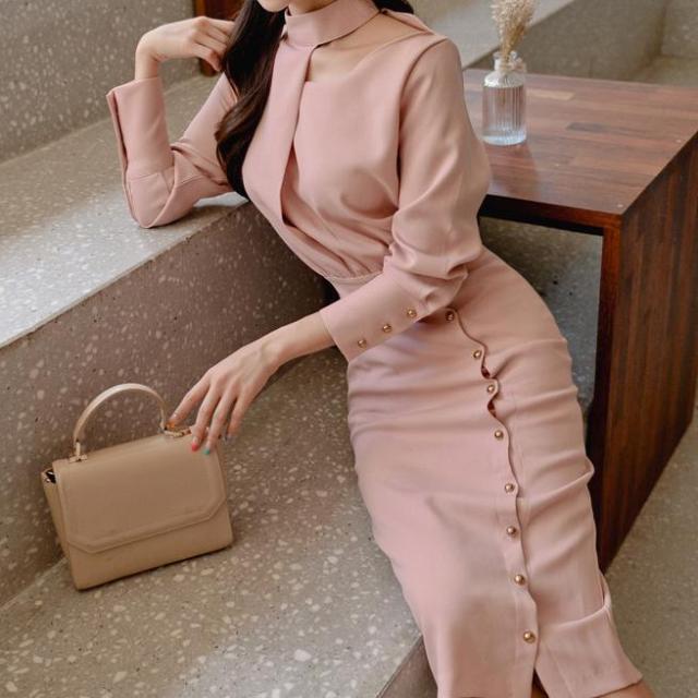 チラ見えした鎖骨が色気を漂わせるエレガントなドレスワンピ