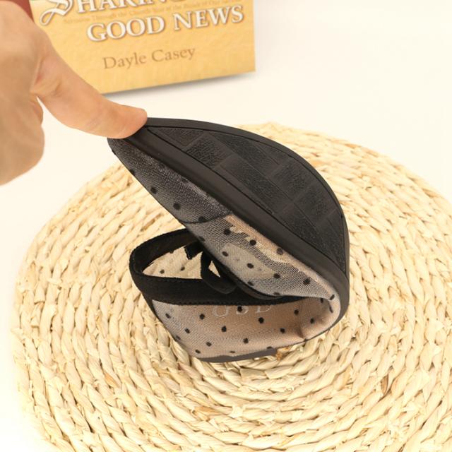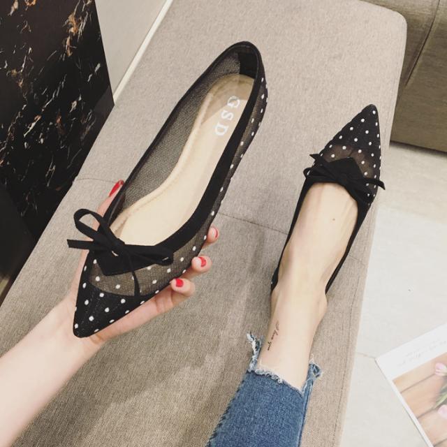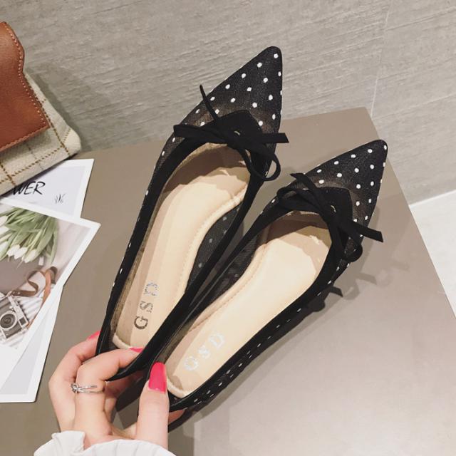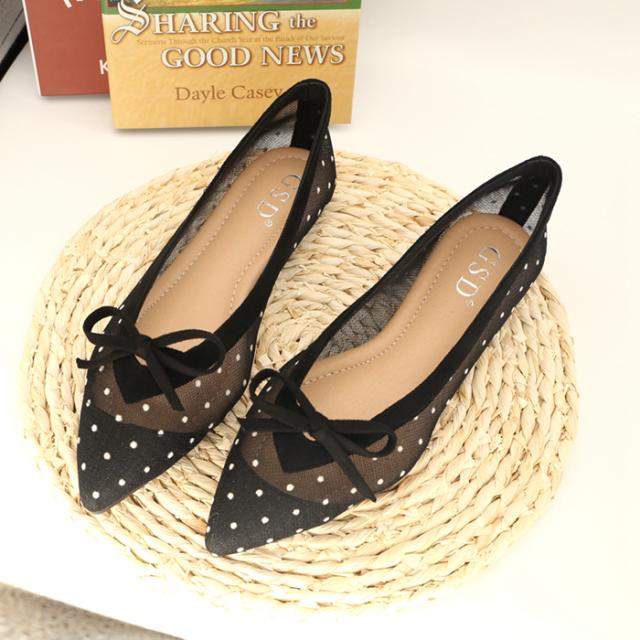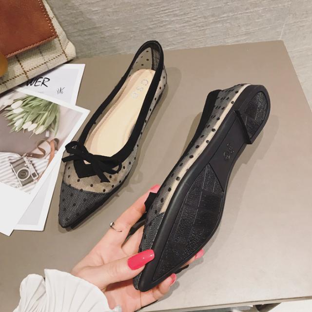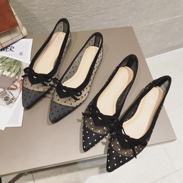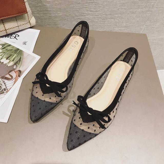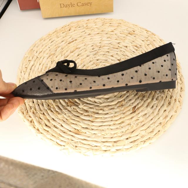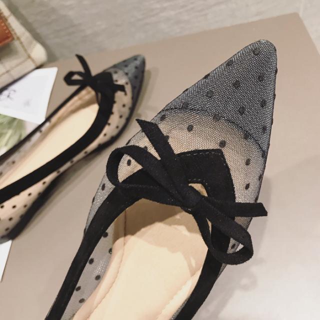 サイドがシースルーのドットになったデザインのポインテッドトゥパンプス。