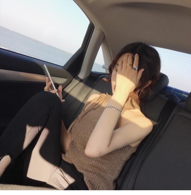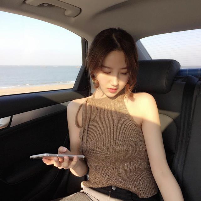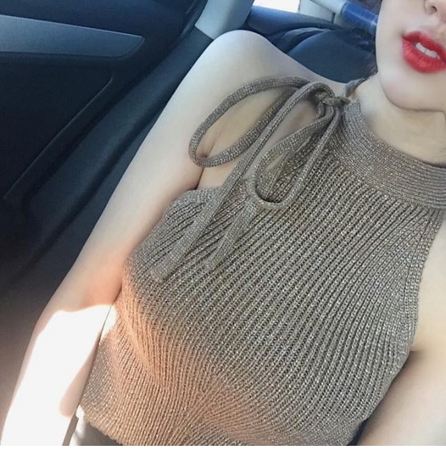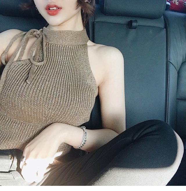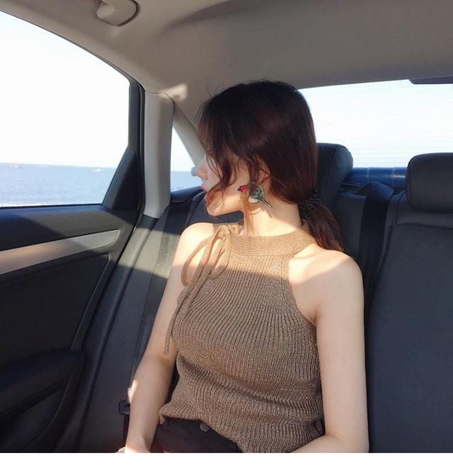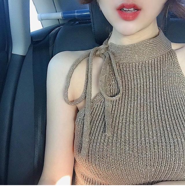 首の横で縛るホルターネック風が可愛いサマーニットトップスです。
