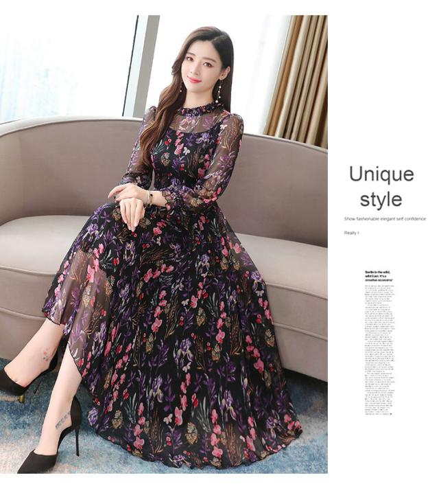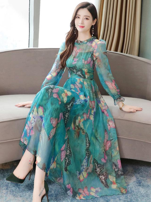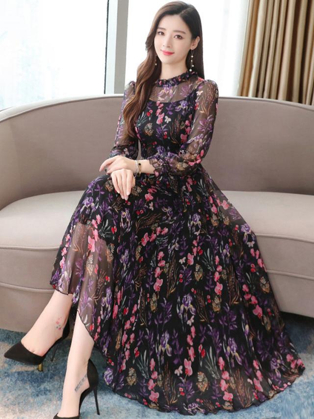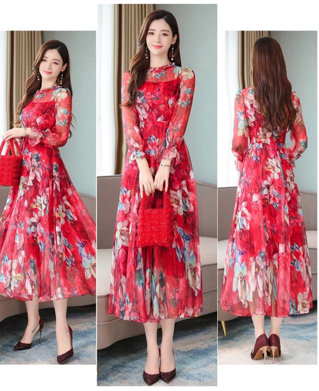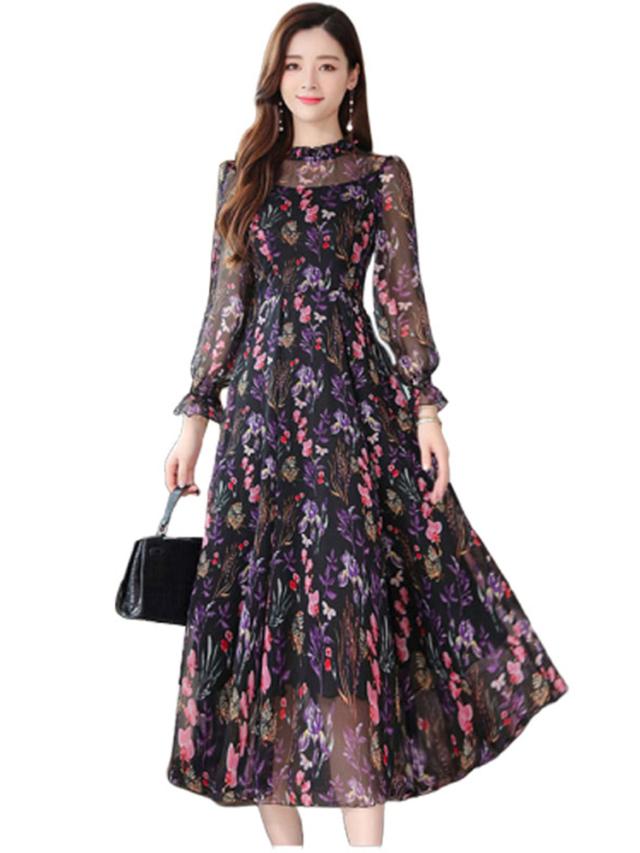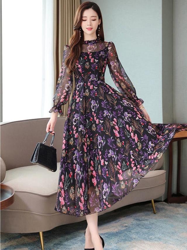 花柄 シフォン ワンピース フレアワンピース 膝下 ミモレ ミモレ丈 7分丈 ミディアム丈 袖あり ボリューム袖 ハイネック プチハイネック フレア チュール シフォン ウエストマーク 透け感 シースルー かわいい 大人可愛い きれいめ カジュアル 大人 上品 おしゃれ アジアン 大人女子 ラブリー モード系 エレガント 柄 花柄 シーズンレス 成人式 謝恩会 結婚式 二次会 披露宴 冠婚葬祭 10代 20代 30代 40代 レディース 女性用 デート パーティー ホテル 韓国系 コーデ モテ