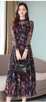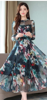 花柄 シフォン ワンピース フレアワンピース 膝下 ミモレ ミモレ丈 7分丈 ミディアム丈 袖あり ボリューム袖 ハイネック プチハイネック フレア チュール シフォン ウエストマーク 透け感 シースルー かわいい 大人可愛い きれいめ カジュアル 大人 上品 おしゃれ アジアン