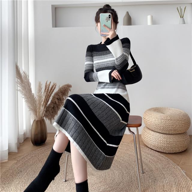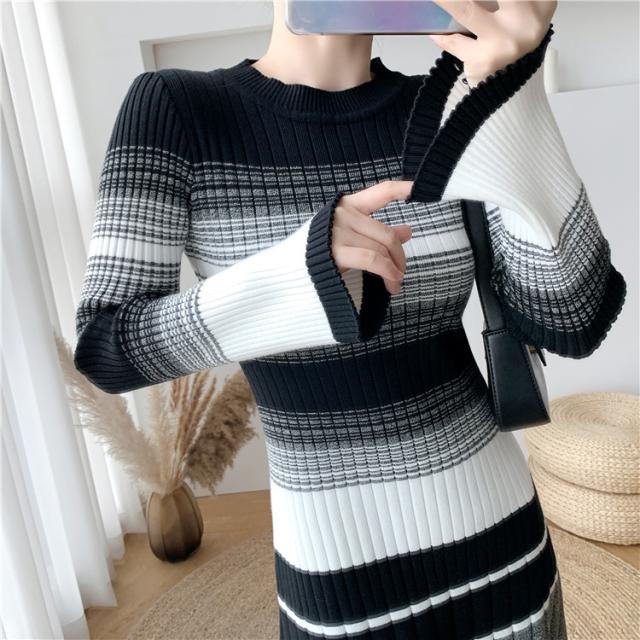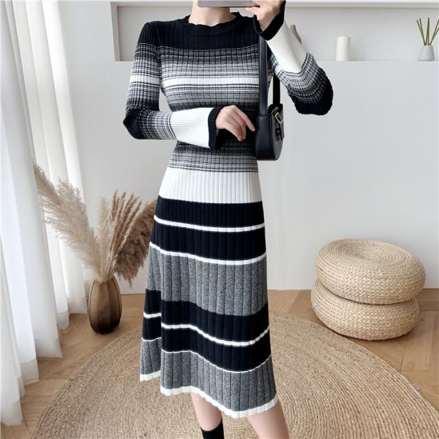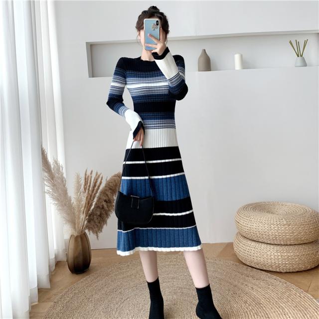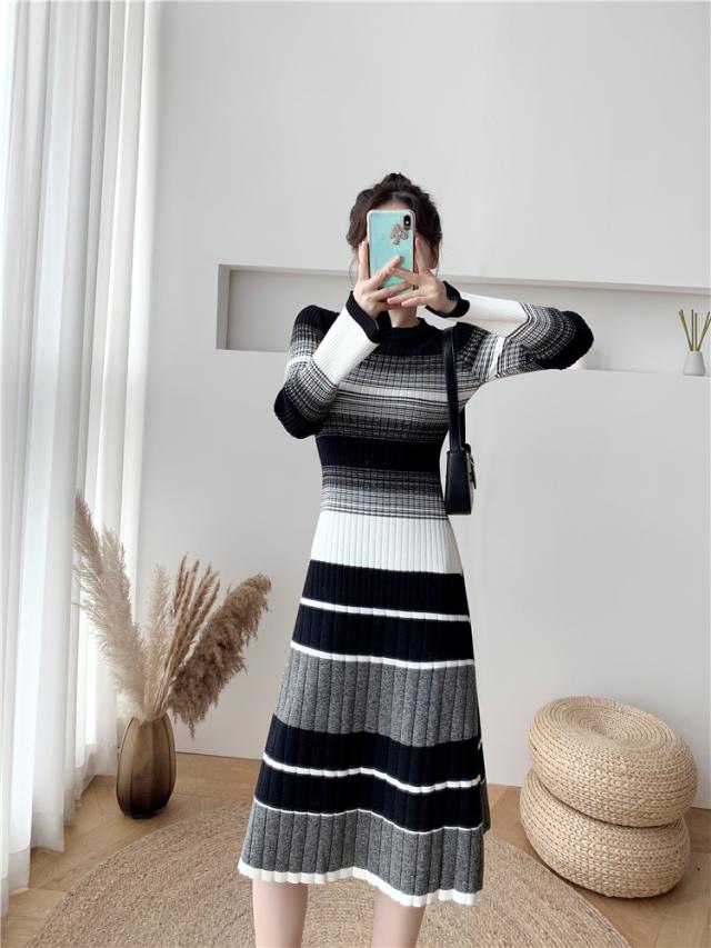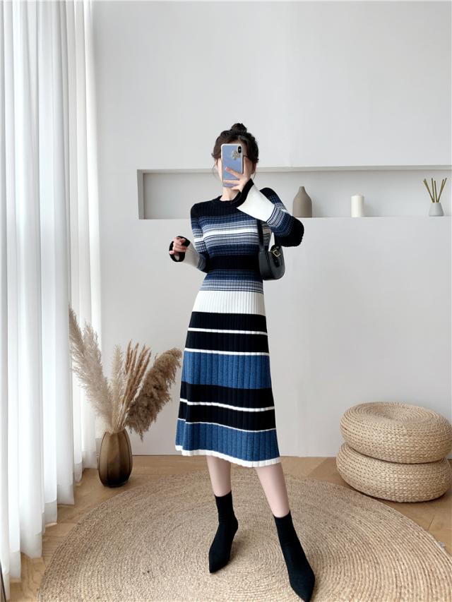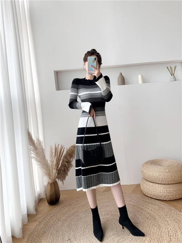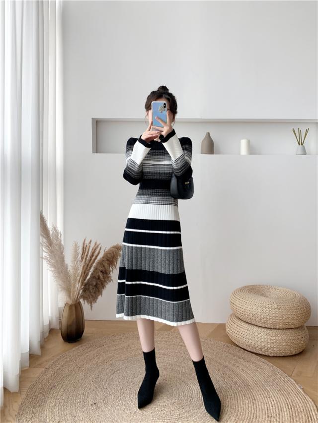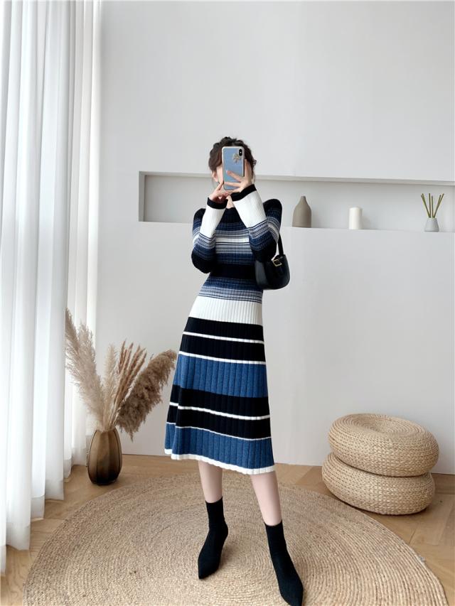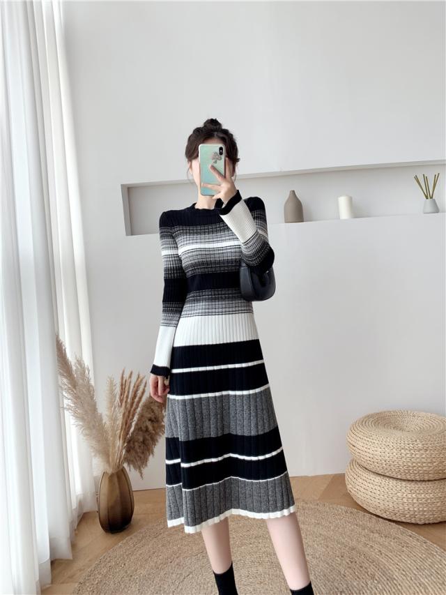 グラデーション マルチボーダー ニットワンピース ワンピドレス 膝下 ミモレ ミモレ丈 袖あり 長袖 Uネック セミフレア Aライン リブニット 編み込み 伸縮性 かわいい 大人可愛い きれいめ カジュアル 大人 上品 おしゃれ 大人女子 こなれ感 ラブリー キュート 個性的 モード系 モダン 主役級 存在感 清楚 お嬢様 ボーダー 秋 冬 10代 20代 30代 40代 オフィス ビジネス OL 通勤 デート お出かけ 休日 普段使い 韓国系 ファッション モテ 体系カバー インスタ映え 高見え S M