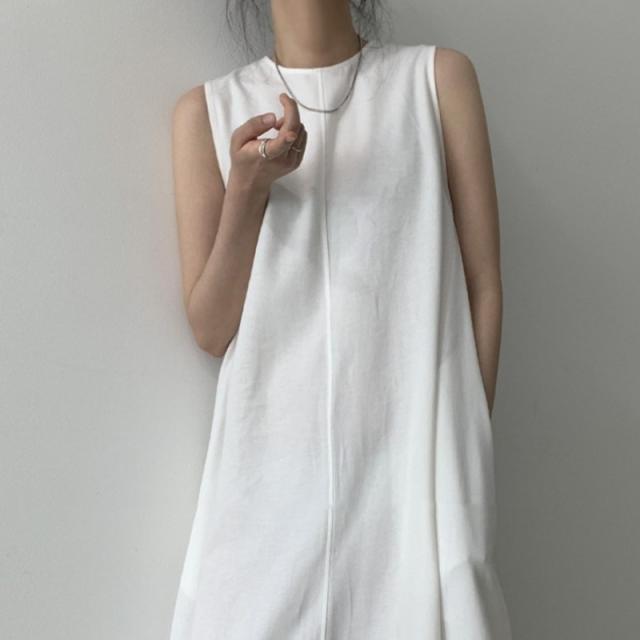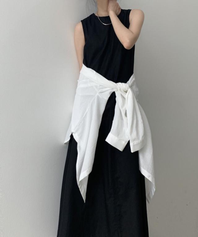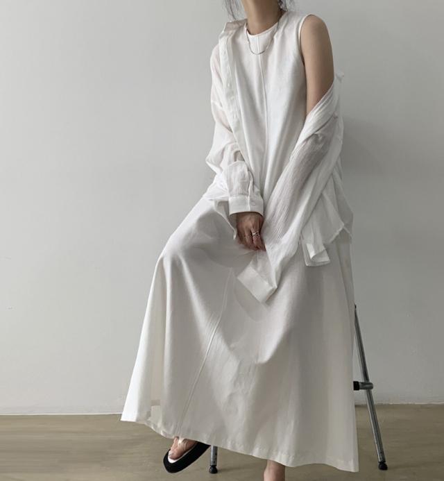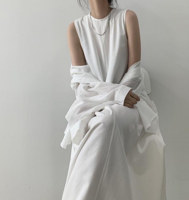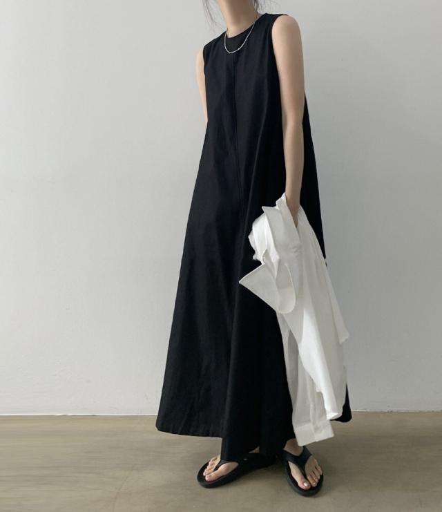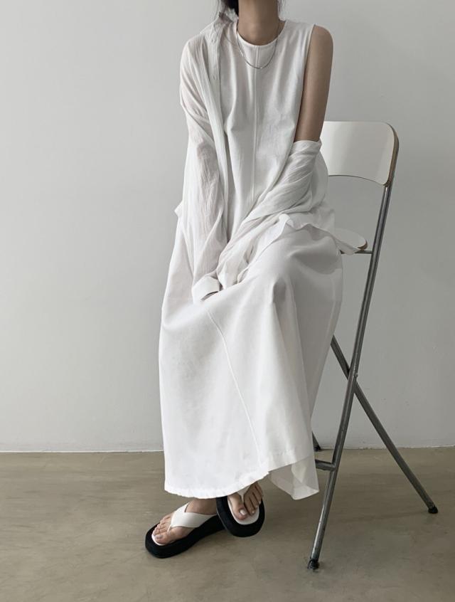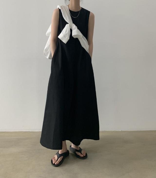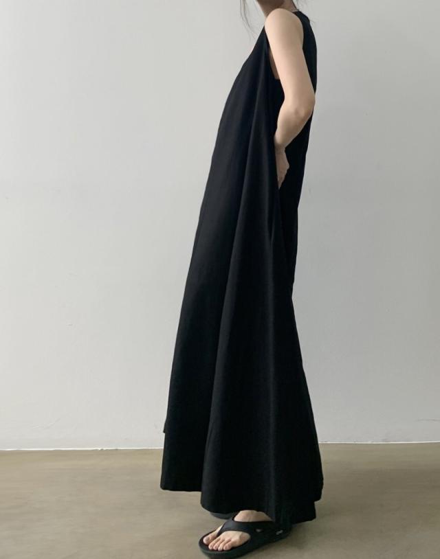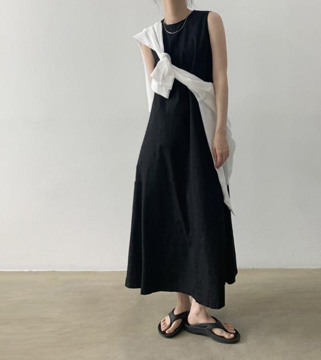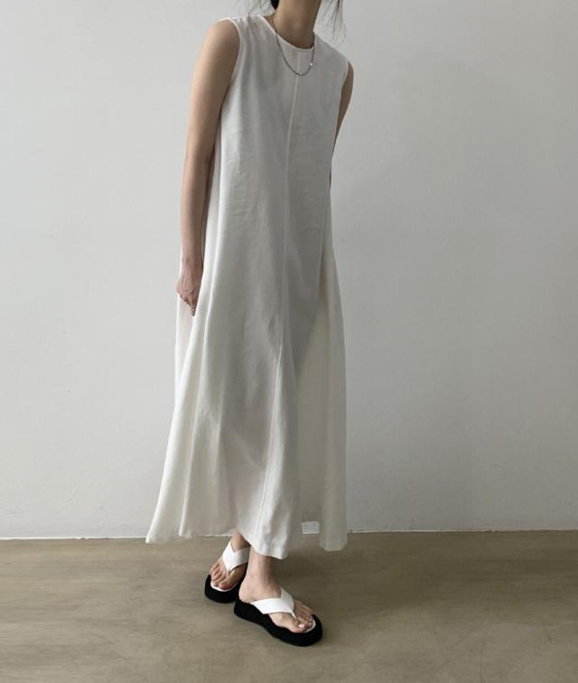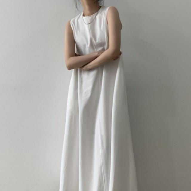 軽やかなノースリーブとマキシ丈のボリューム感がバランスの良いワンピース。