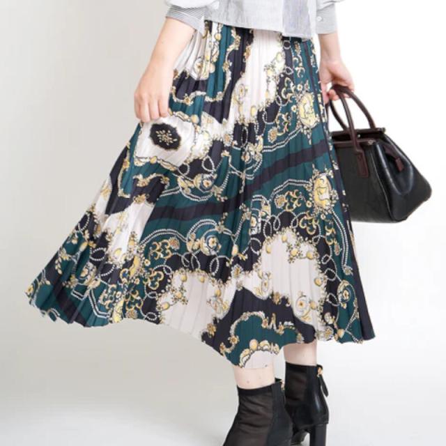プリーツスカート ボトムス ロング丈 ミドル丈 プリーツ ウエストゴム かわいい 大人可愛い きれいめ ヨーロピアン シンプル カジュアル 大人 上品 おしゃれ かっこいい レトロ 大人女子 こなれ感 ラフ エレガント 花柄 チェーン柄 スカーフ柄 プリント 春 秋 10代 20代 30代