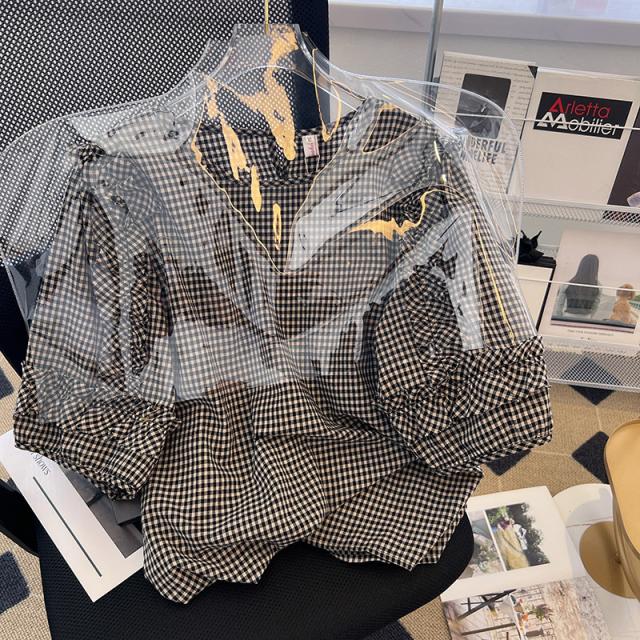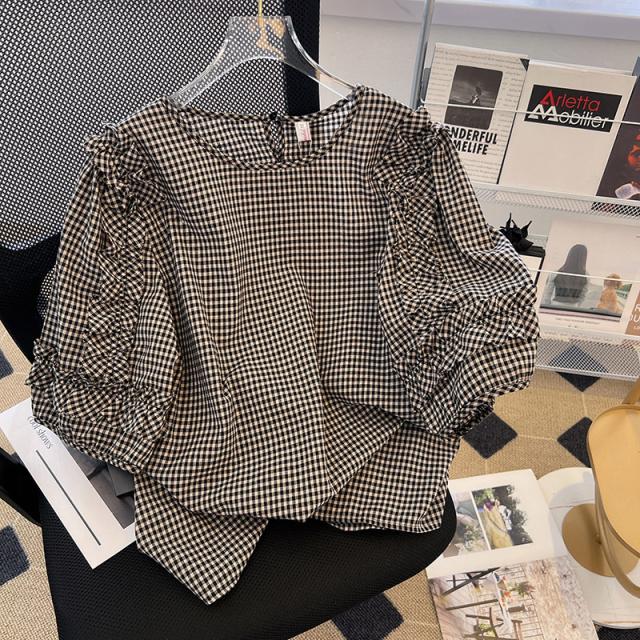 ギンガムチェック フレア袖 体系カバー ブラウス トップス プルオーバー 袖あり Uネック ラウンドネック クルーネック 襟なし かわいい 大人可愛い きれいめ カジュアル 大人 上品 おしゃれ 大人女子 こなれ感 ラブリー キュート ガーリー 個性的 主役級 存在感 抜け感