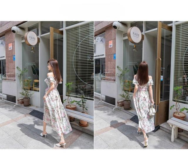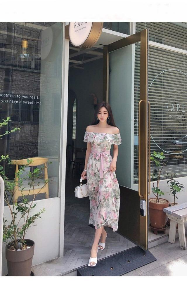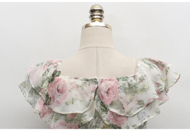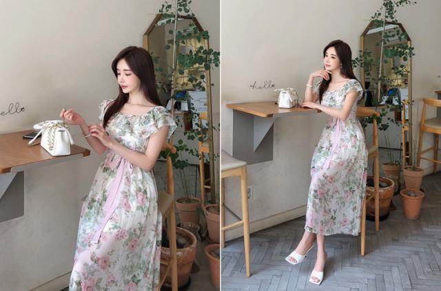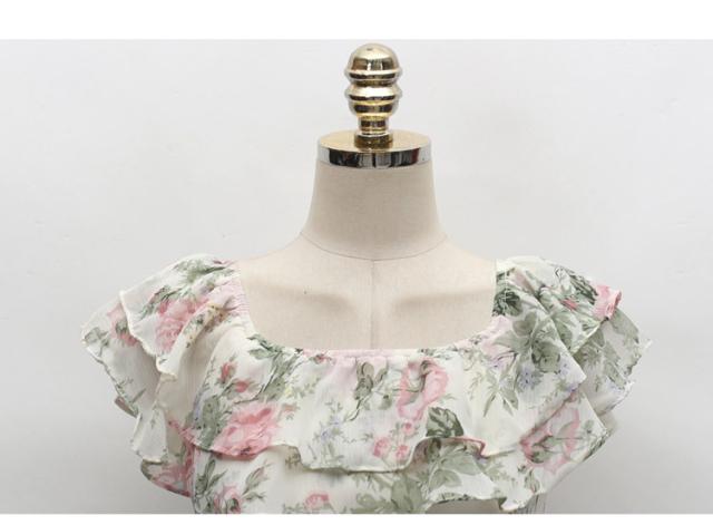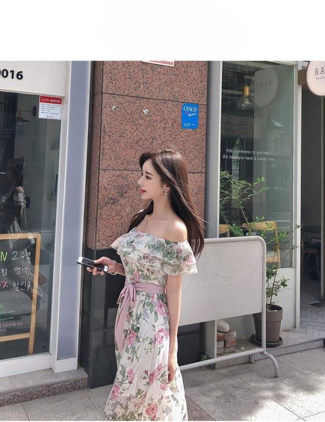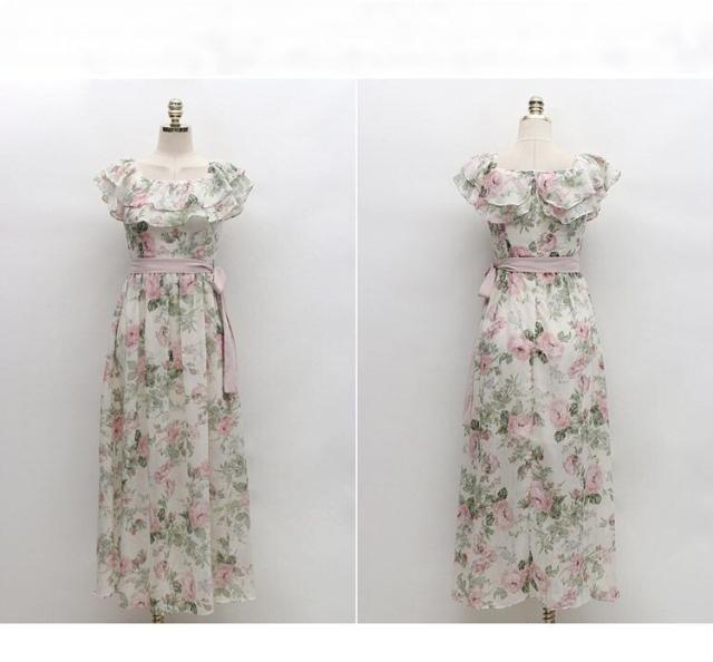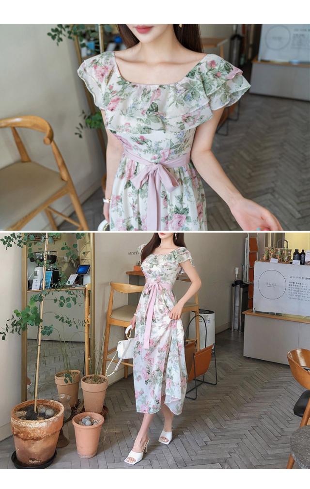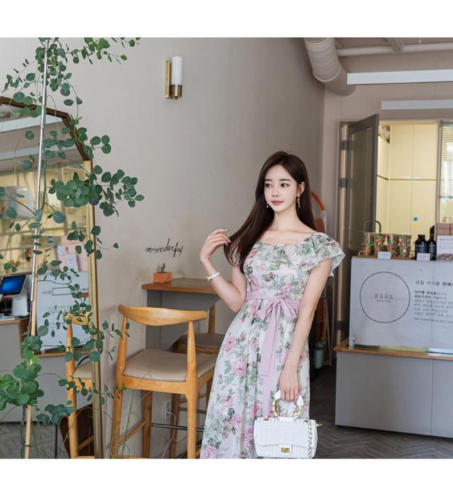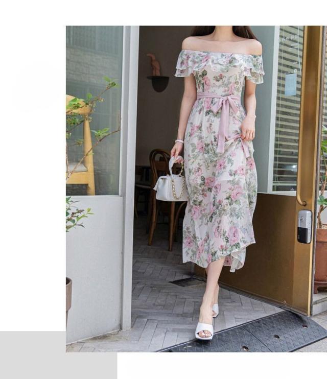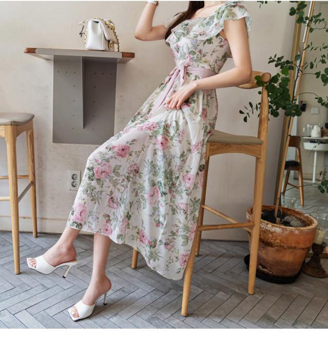 ワンピース ワンピドレス 膝下 袖あり フレアスリーブ 萌袖 ワンショルダー フレア シフォン フリル ウエストマーク ウエストリボン ふわふわ 透け感 かわいい 大人可愛い きれいめ おしゃれ 大人可愛い ラブリー キュート ガーリー セクシー フォーマル 花柄 夏 結婚式