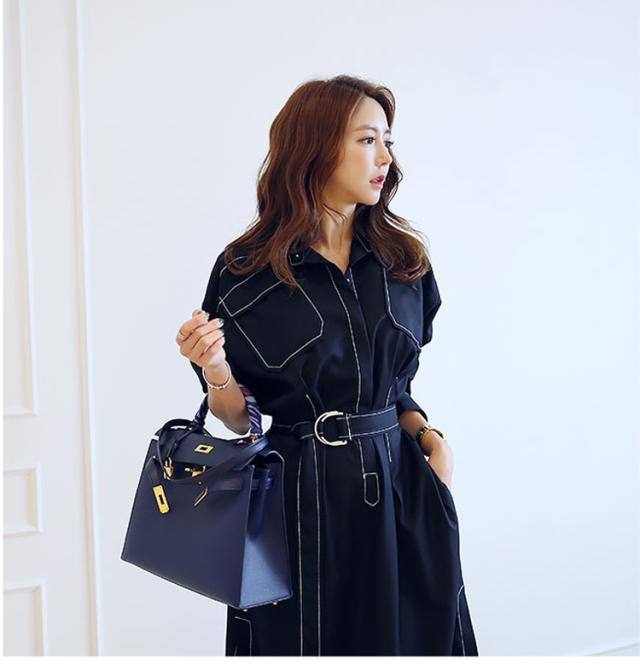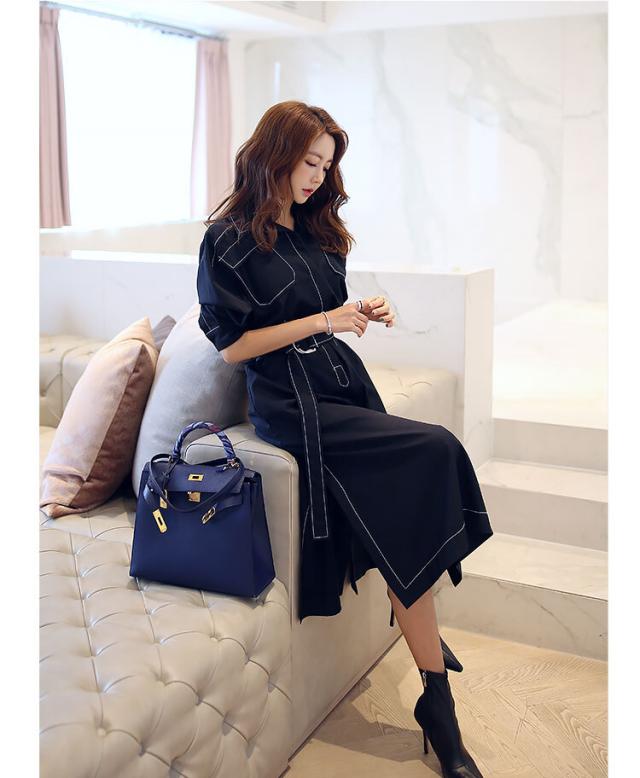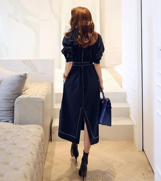 ホワイトステッチ ロング ワンピース シャツワンピース デニムワンピース ロング丈 袖あり 5分袖 五分袖 襟付き ストレート ベルト ウエストマーク サイドスリット バックスリット ブルーデニム カラーデニム かわいい 大人可愛い きれいめ シンプル カジュアル 大人 上品 おしゃれ 大人女子 こなれ感 クール モード系 無地 春 夏 10代 20代 30代 40代 オフィス ビジネス OL 通勤 デート 休日 着回し 普段使い 韓国系 コーデ トレンド 流行 インスタ映え S M L XL 2色展開