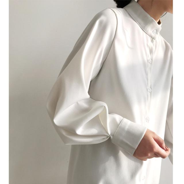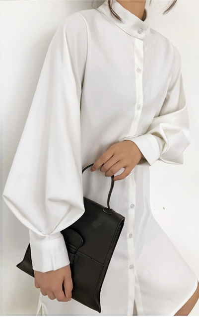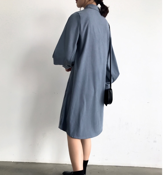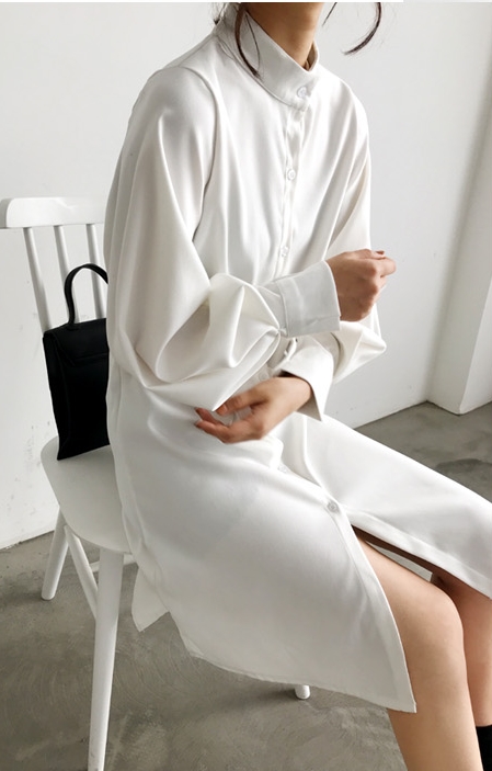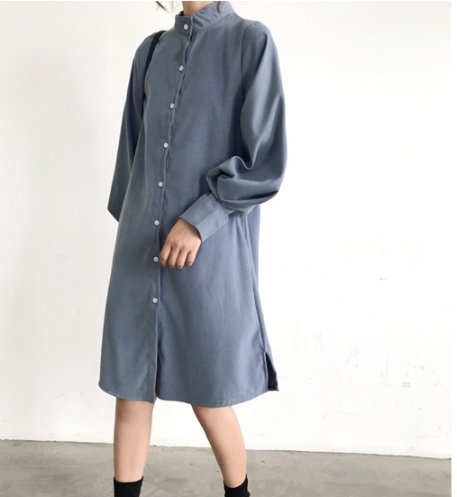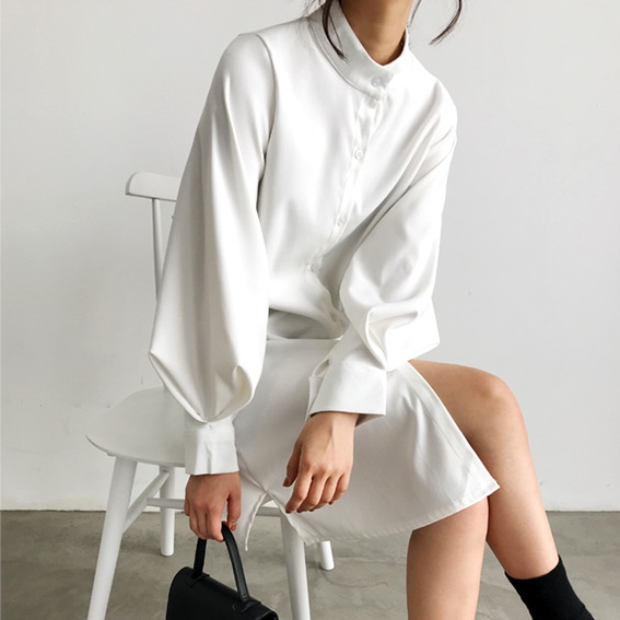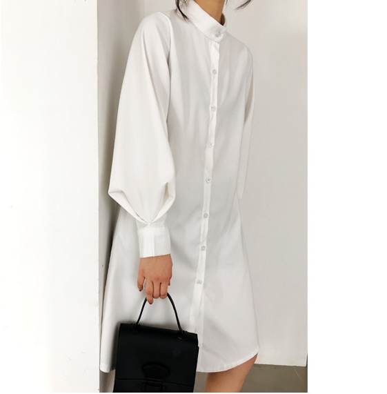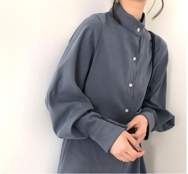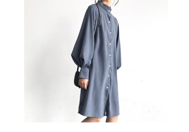 バンドカラー シャツワンピ パフスリーブ ワンピース 膝丈 ひざ丈 長袖 ポワン袖 スタンドカラー マオカラー Iライン 前開き かわいい 大人可愛い きれいめ シンプル カジュアル 大人 上品 おしゃれ 大人女子 こなれ感 ラフ ラブリー ルーズ モダン とろみ感 無地 春 秋 10代 20代 30代 40代 50代 60代 デート お出かけ 休日 着回し 普段使い 重ね着 韓国系 ファッション 体系カバー トレンド 流行 S M L XL 3色展開 ホワイト ブルー カーキ くすみカラー