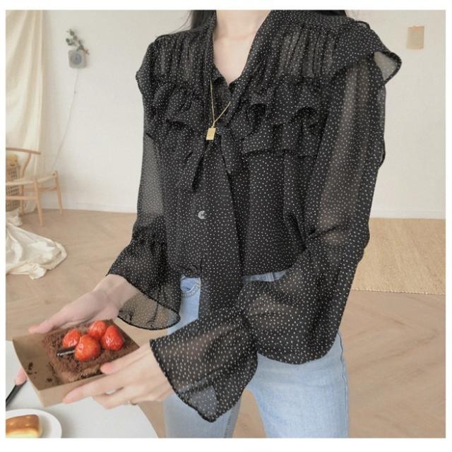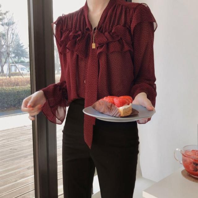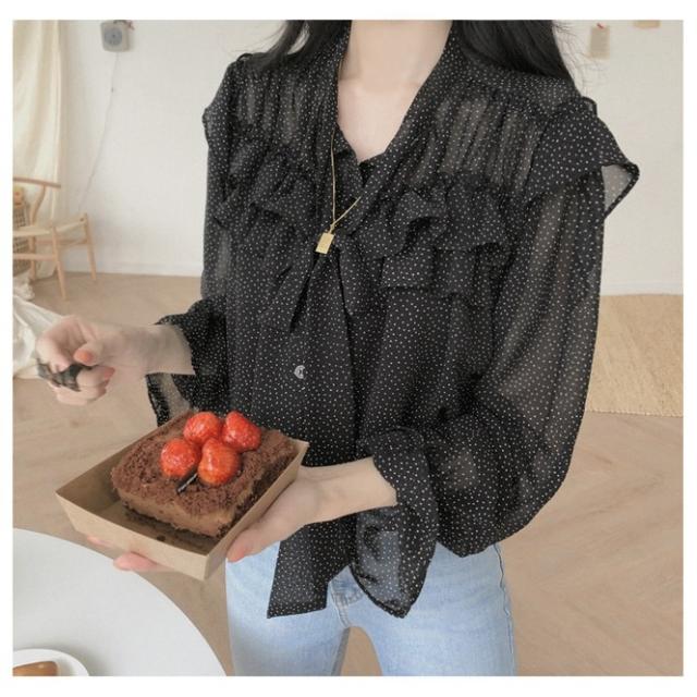 トップス ブラウス 袖あり 長袖 襟なし フリル リボン 透け感 シースルー かわいい 大人可愛い きれいめ シンプル カジュアル 上品 おしゃれ レトロ 大人女子 こなれ感 ラブリー キュート ガーリー エレガント とろみ感 抜け感 ドット柄 水玉 春 秋 10代 20代 30代 レディース デート お出かけ 女子会 着回し 普段使い 重ね着 韓国 オルチャン ファッション コーデ スタイル 楽ちん モテ 体系カバー 定番 プチプラ トレンド インスタ映え ゆったり ブラック ワインレッド 大人カラー