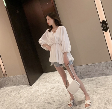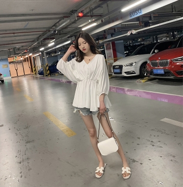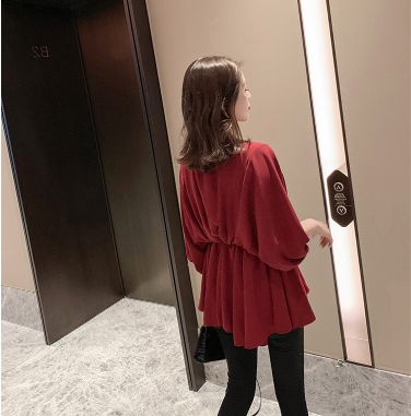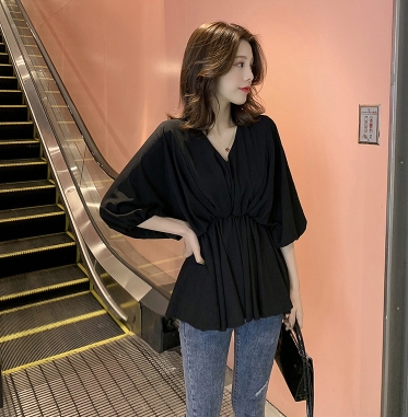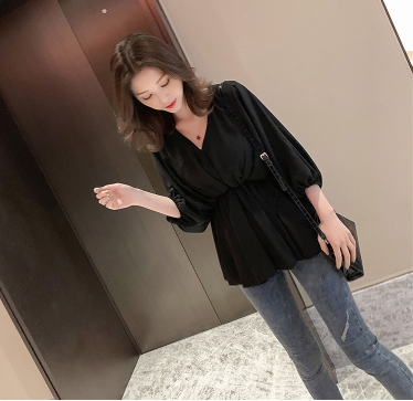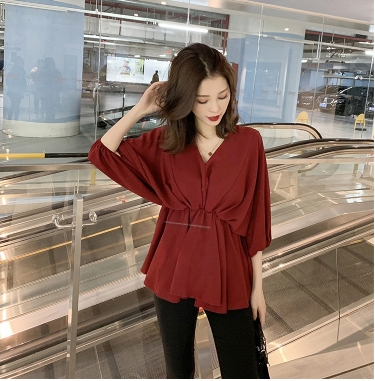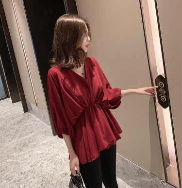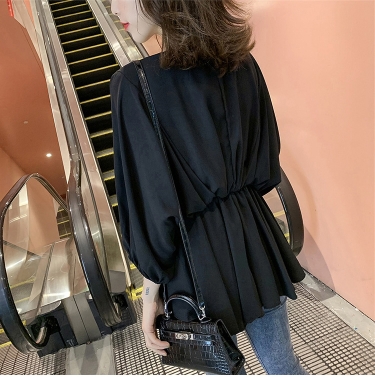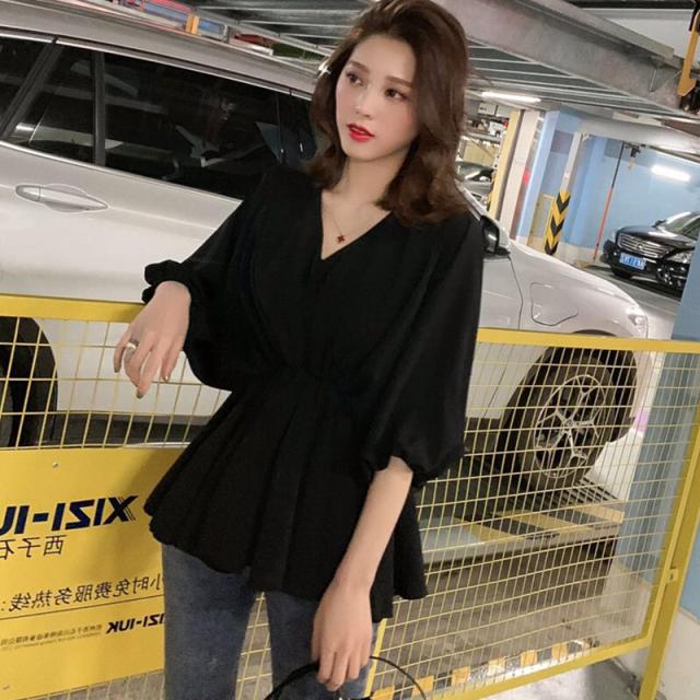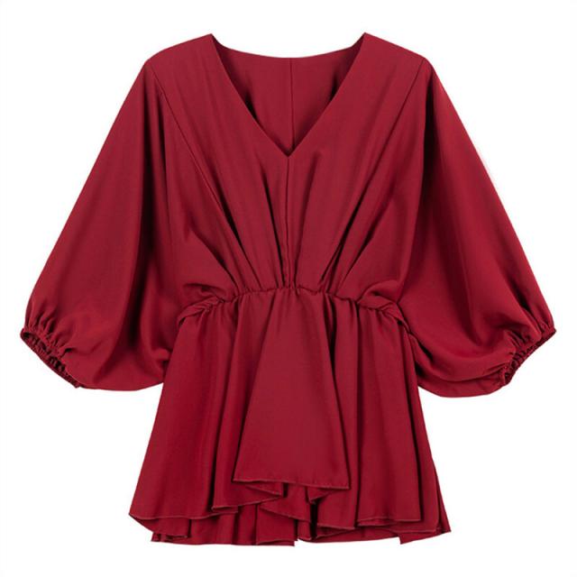 ウエストしぼり バルーン袖 シフォン とろみブラウス Vネック トップス ブラウス チュニック 袖あり 7分袖 七分袖 ボリューム袖 ドルマンスリーブ フレア ウエストマーク かわいい 大人可愛い きれいめ シンプル カジュアル 大人 上品 おしゃれ ラブリー キュート モード系