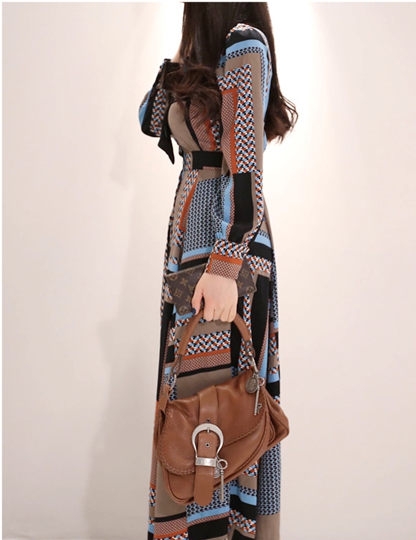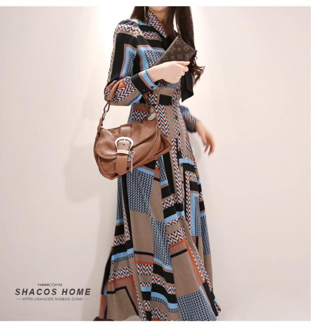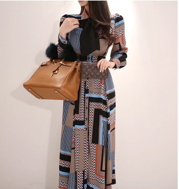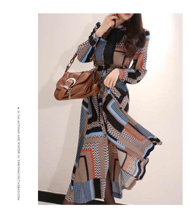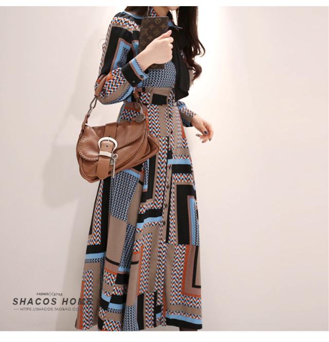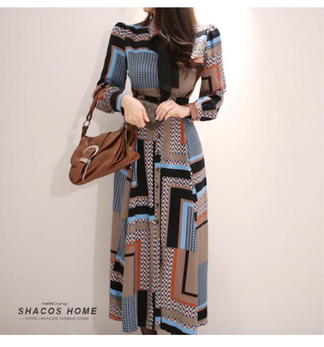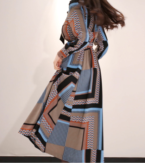 幾何学模様 ワンピース シャツワンピース フレアワンピース ロング ロング丈 マキシ マキシ丈 9分丈 アンクル丈 袖あり 長袖 襟付き スタンドカラー セミフレア 細身 スマート リボン ベルト ウエストマーク 前開き かわいい 大人可愛い きれいめ カジュアル 大人 上品 おしゃれ お洒落 レトロ 大人女子 こなれ感 個性的 クール モード系 主役級 存在感 とろみ感 秋 冬 謝恩会 20代 30代 40代 レディース 女性用 OL 通勤 デート お出かけ 休日 パーティー ホテル レストラン 韓国