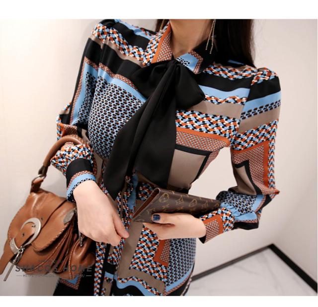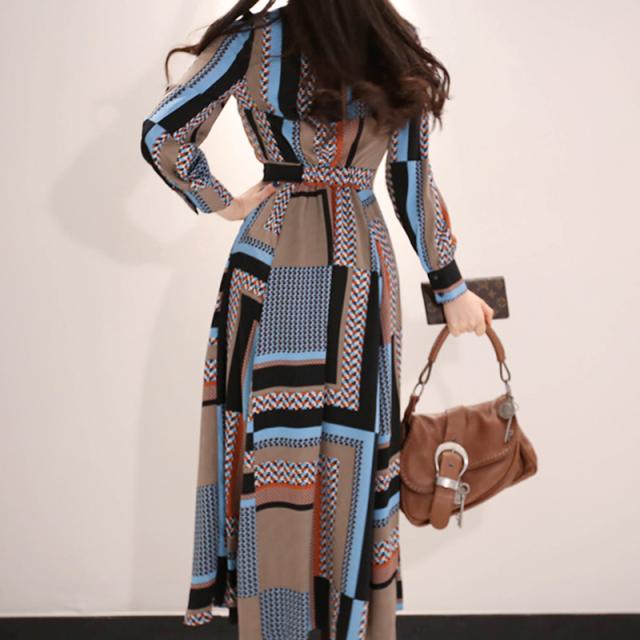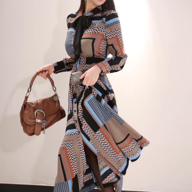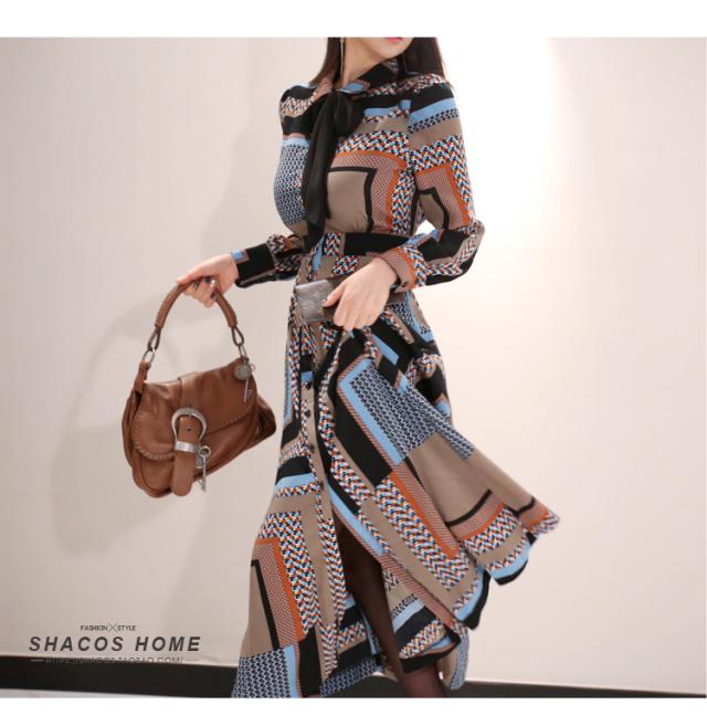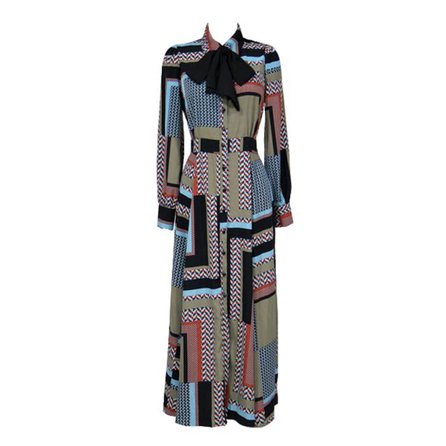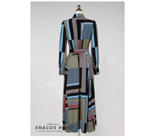 幾何学模様 ワンピース シャツワンピース フレアワンピース ロング ロング丈 マキシ マキシ丈 9分丈 アンクル丈 袖あり 長袖 襟付き スタンドカラー セミフレア 細身 スマート リボン ベルト ウエストマーク 前開き かわいい 大人可愛い きれいめ カジュアル 大人 上品