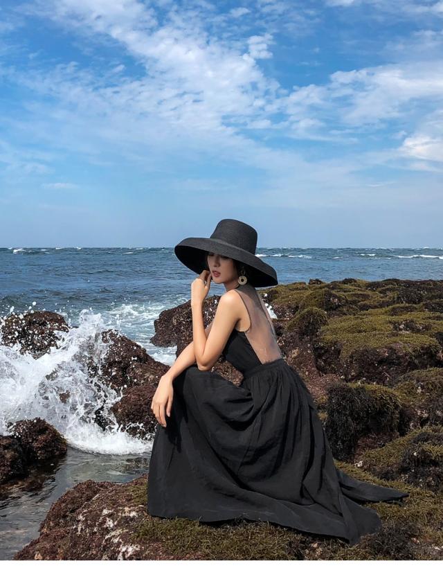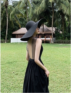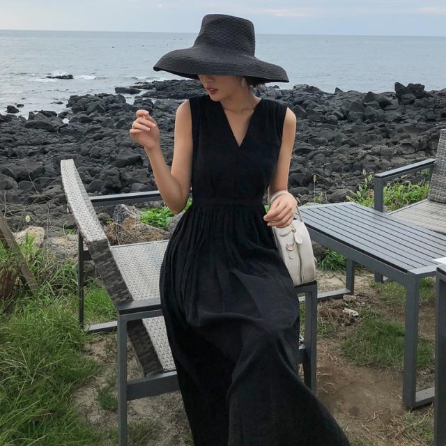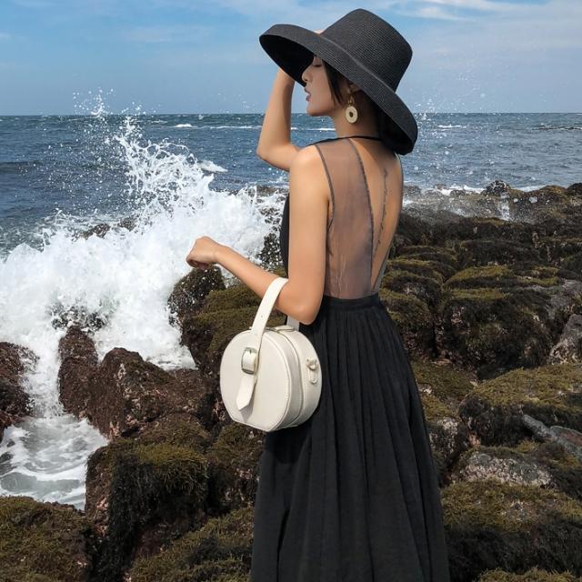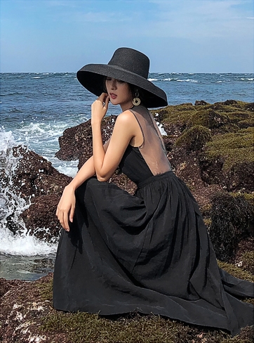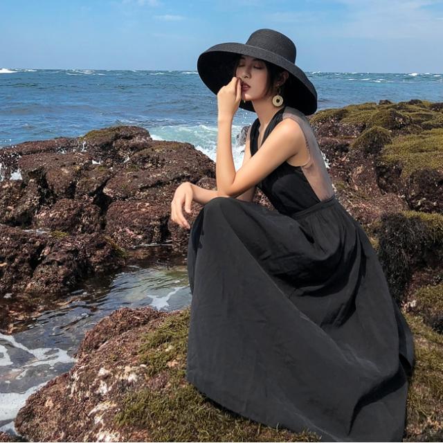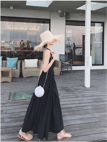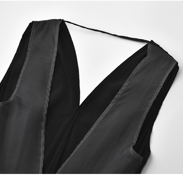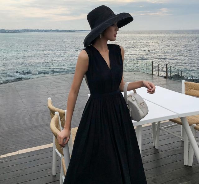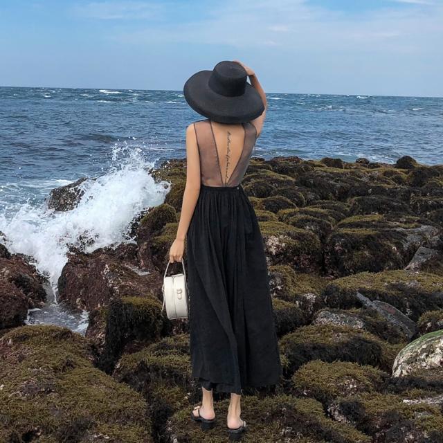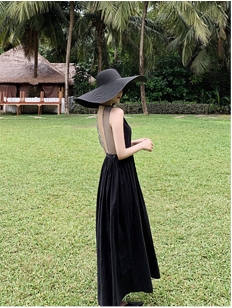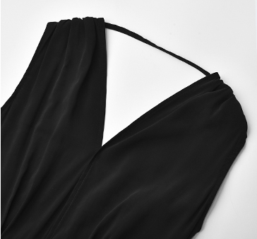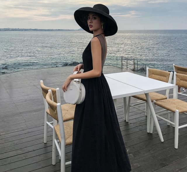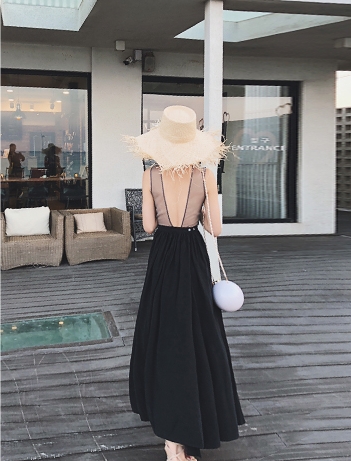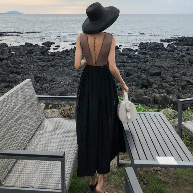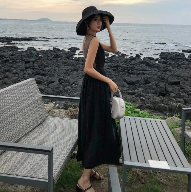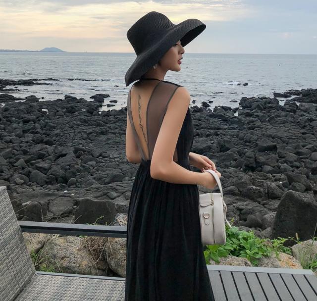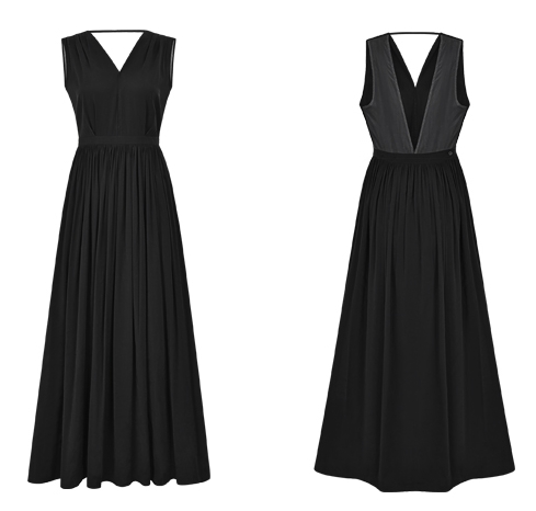 背中がV字に開いたフレアドレス。