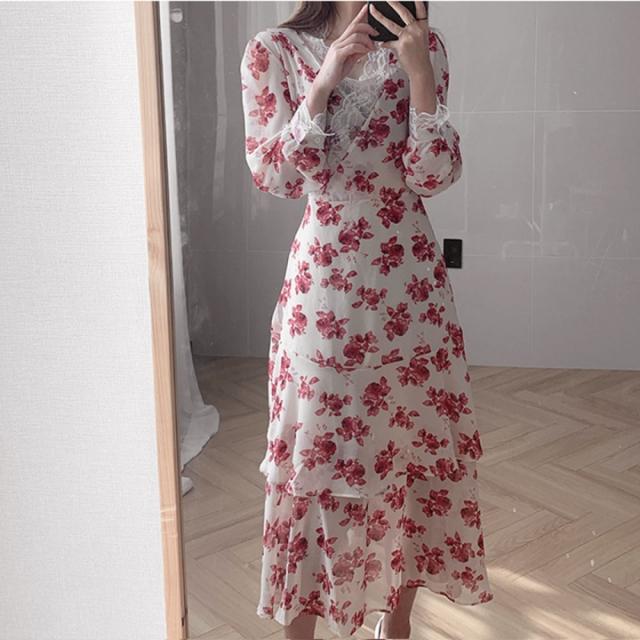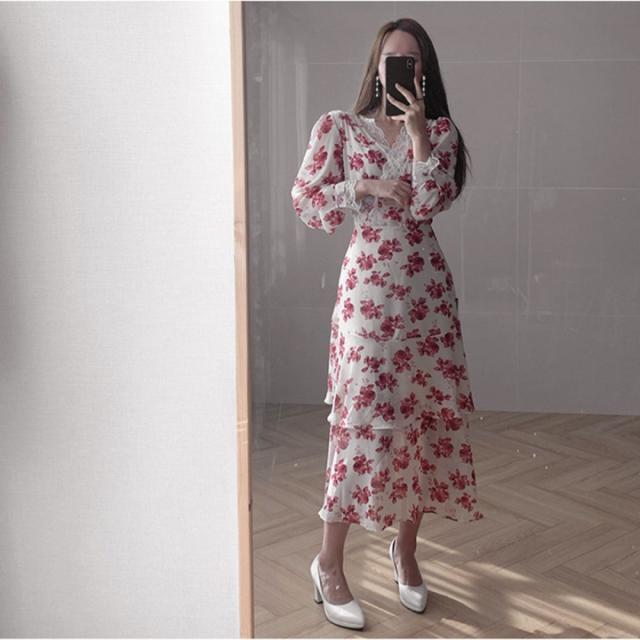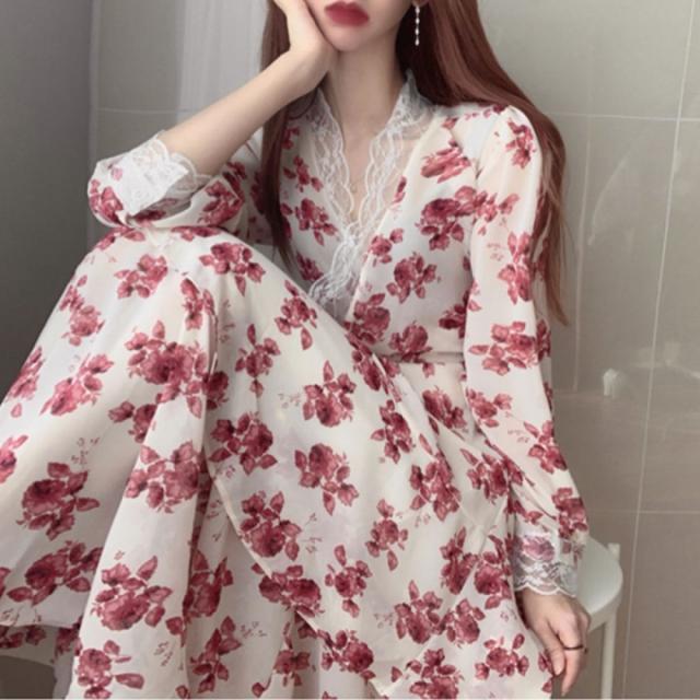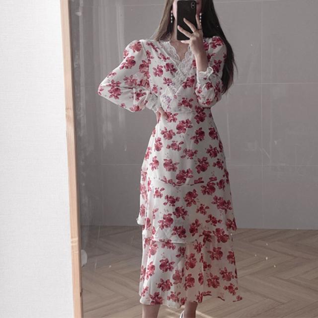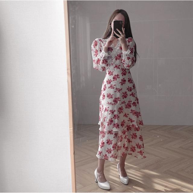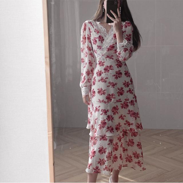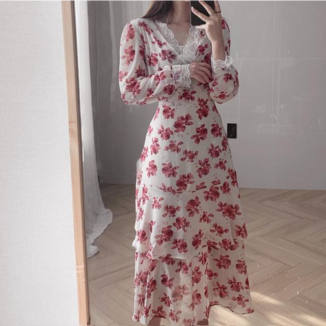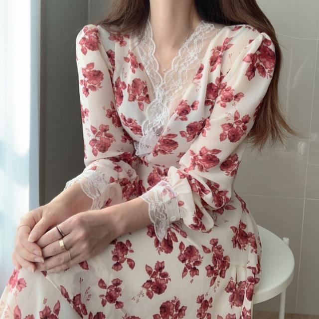 花柄 Vネック ロング ワンピース ロングスカート フレアワンピース ロング ロング丈 マキシ マキシ丈 アンクル丈 袖あり 長袖 ボリューム袖 パフスリーブ Vネック カシュクール フレア レース ハイウエスト かわいい 大人可愛い きれいめ 大人 上品 おしゃれ アジアン こなれ感 ラブリー キュート ガーリー エレガント 主役級 存在感 とろみ感 花柄 春 秋 謝恩会 二次会 10代 20代 30代 40代 レディース デート お出かけ 女子会 休日 普段使い 韓国 スタイル モテ フリーサイズ