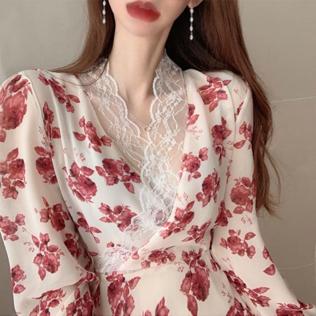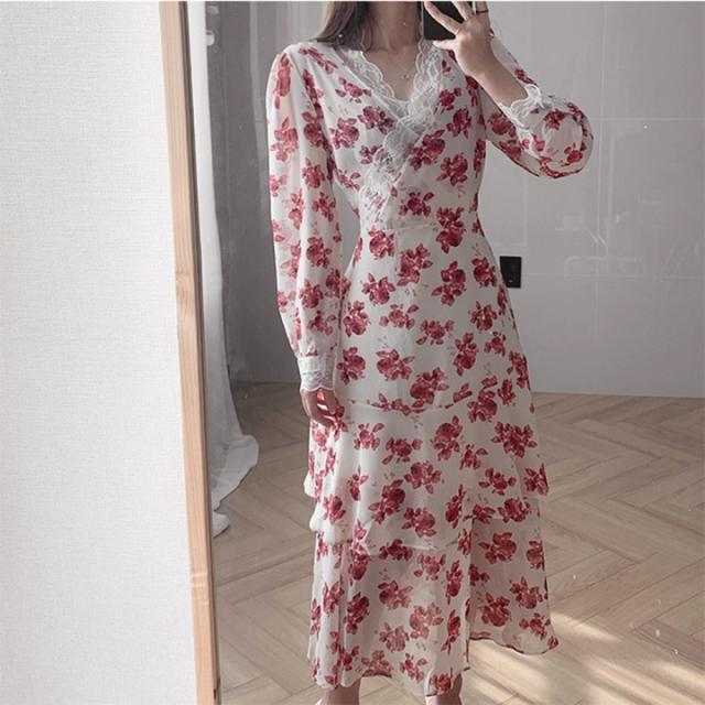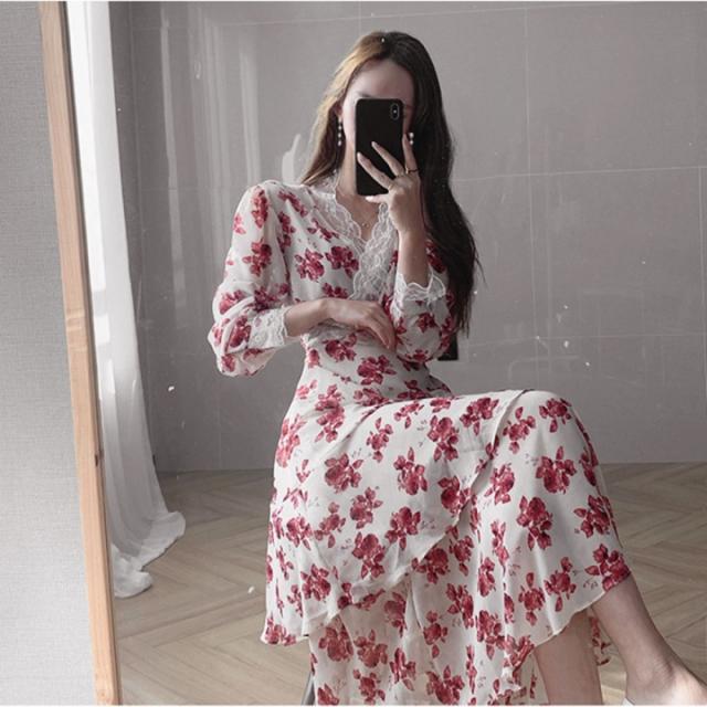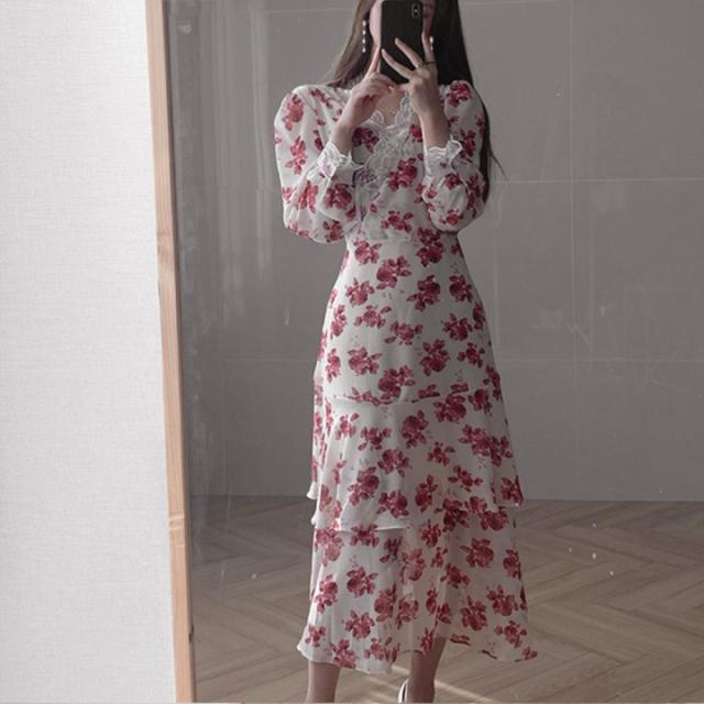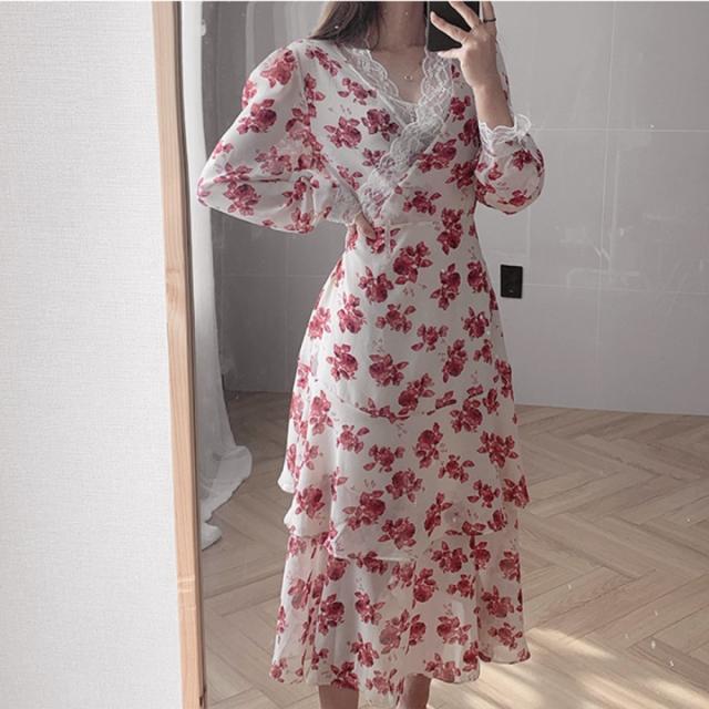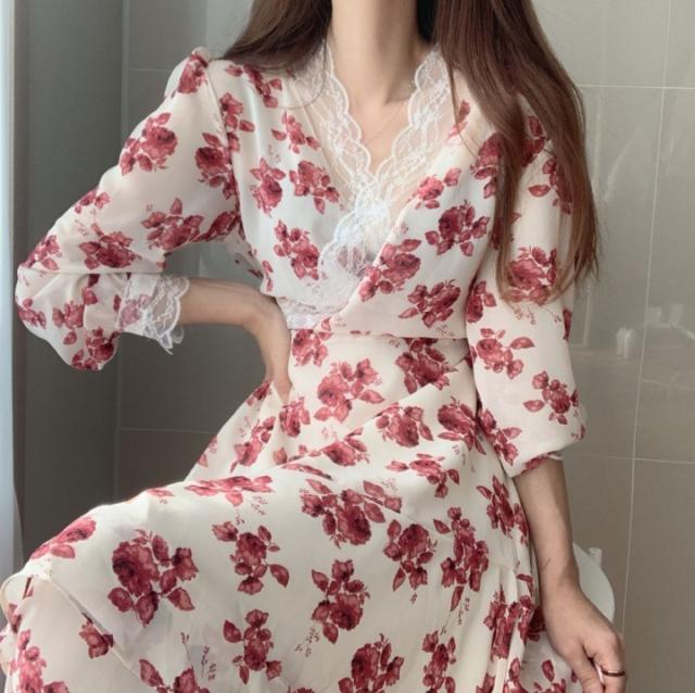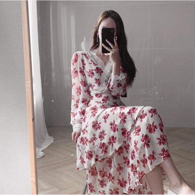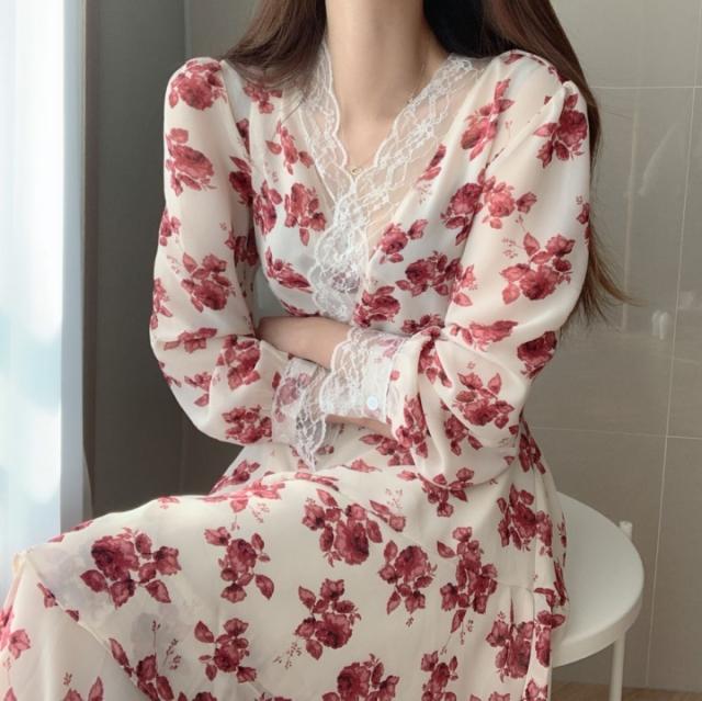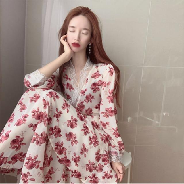 花柄 Vネック ロング ワンピース ロングスカート フレアワンピース ロング ロング丈 マキシ マキシ丈 アンクル丈 袖あり 長袖 ボリューム袖 パフスリーブ Vネック カシュクール フレア レース ハイウエスト かわいい 大人可愛い きれいめ 大人 上品 おしゃれ アジアン こなれ感 ラブリー キュート ガーリー エレガント 主役級 存在感 とろみ感 花柄 春 秋 謝恩会 二次会 10代 20代 30代 40代 レディース デート お出かけ 女子会 休日 普段使い 韓国 スタイル モテ フリーサイズ