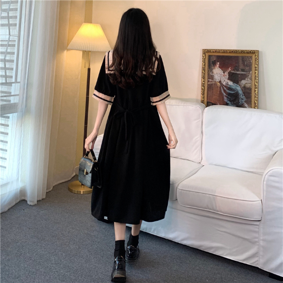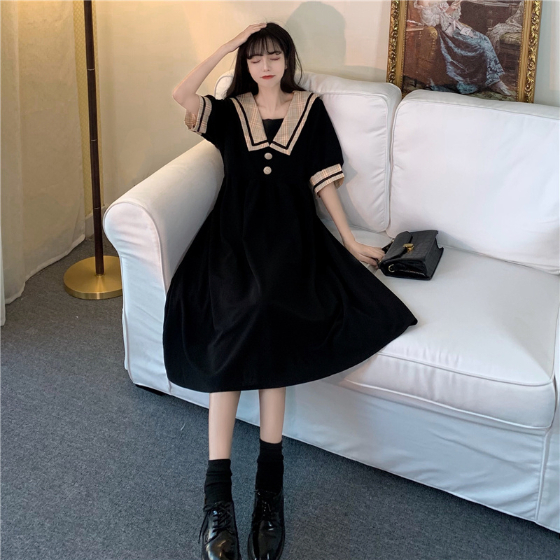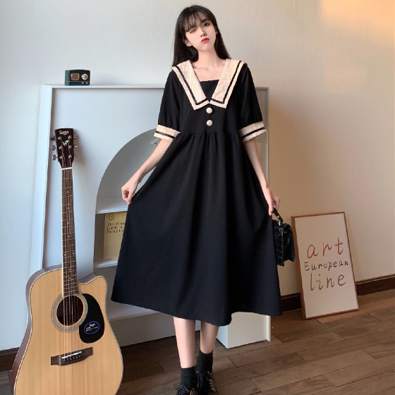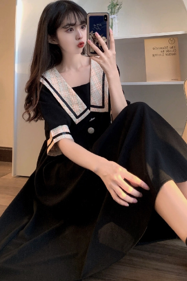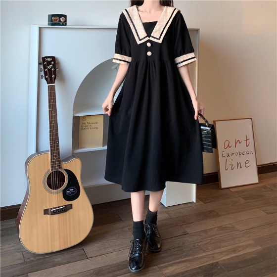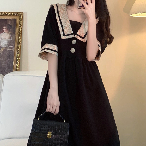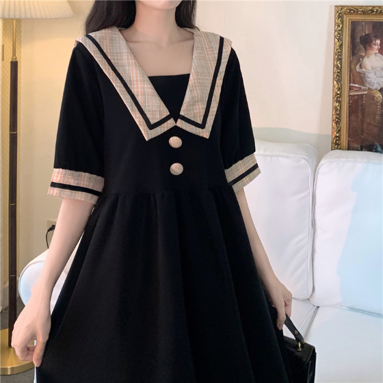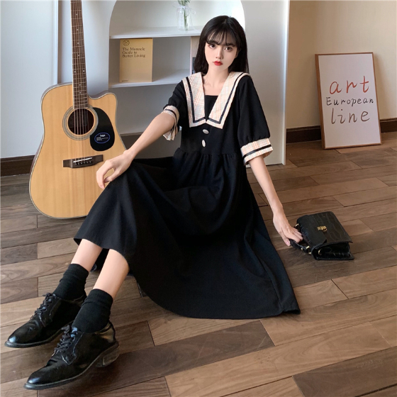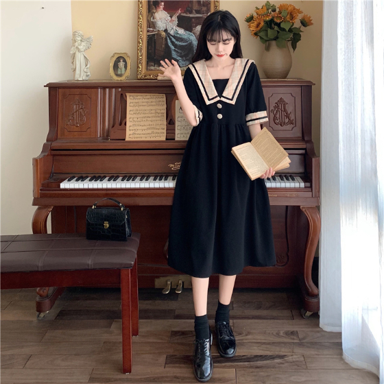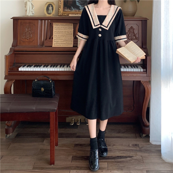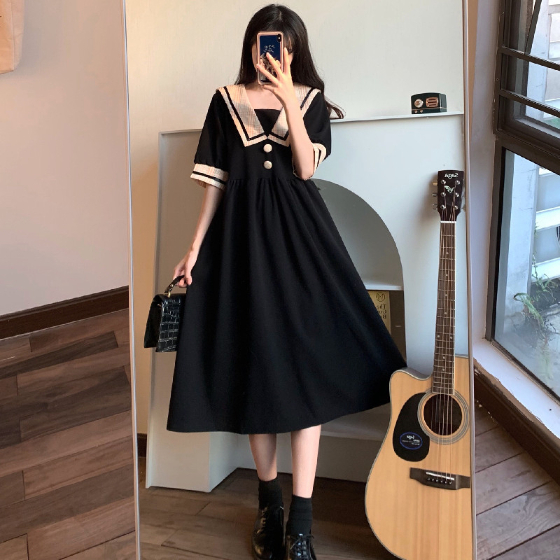 セーラー風レトロワンピース ワンピース デート ワンピドレス ひざ丈 膝下 袖あり 半袖 襟付き 角襟 フレア セミフレア Aライン スマート かわいい 大人可愛い おしゃれ お洒落 かっこいい レトロ こなれ感 ラブリー キュート ガーリー 個性的 主役級 存在感 フォーマル