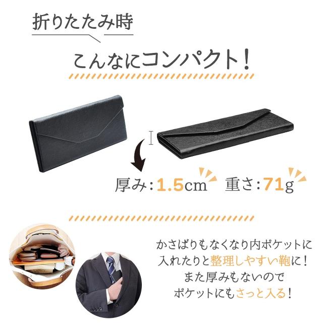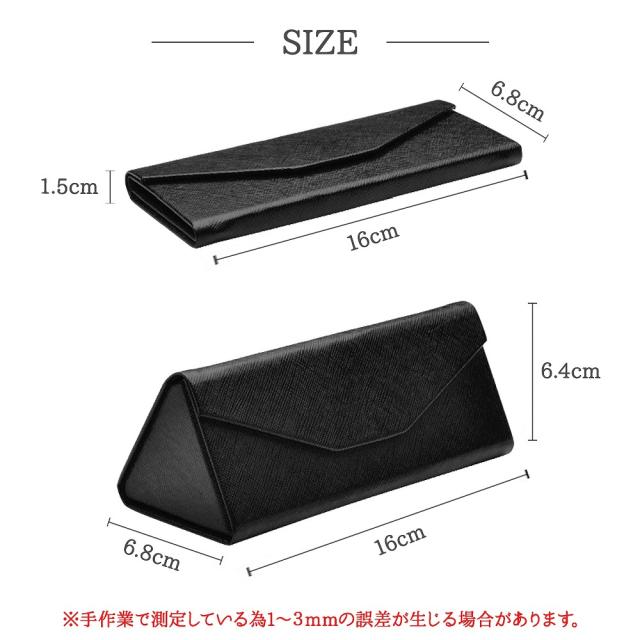 通常は三角型、折りたたんだ時は厚みが1.5cmになります。バッグの中でかさばったり、迷子になったりしていたメガネケースもコンパクトになりバッグの中の収納が綺麗に整います。ポケットやシャツにもストレスなく入れられるのも嬉しいポイント。