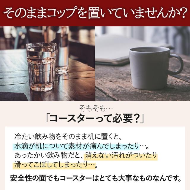 | 商品の説明 | シンプルだから、使いやすい。 機能性とデザイン性を高めた今大人気のアイテム。 どんなお部屋にも机にもぴったり合う人気のこだわりコースターが登場! しっかり受け止める厚みのコースター。 大きめなガラスコップをそのまま机に置くとコップにも机にも衝撃で破損や傷の原因になります。 家具を保護してくれる、優秀な機能性◎ 水滴もしっかりガード。 熱中症、脱水症状予防として氷がたっぷり入ったつめたいお水を飲む際にも大活躍。 知らないうちにたまっていくコップの水滴も、 広がることなくしっかり受け止めてくれる安心安全のコースターです◎ どんなお部屋にもぴったり。 使いやすいシンプルデザインだからこそ、あらゆるコーディネートにぴったり。 和風、洋風、あらゆるお部屋に寄り添ってくれる人気アイテム。 |