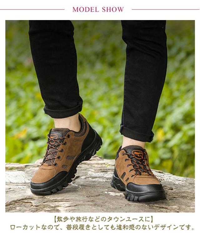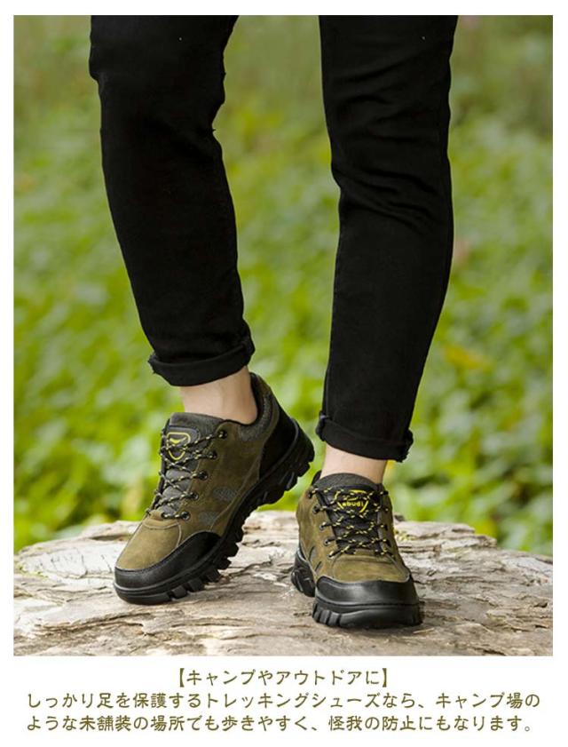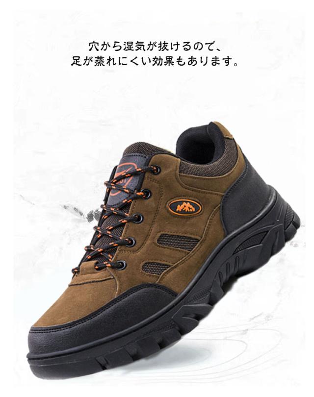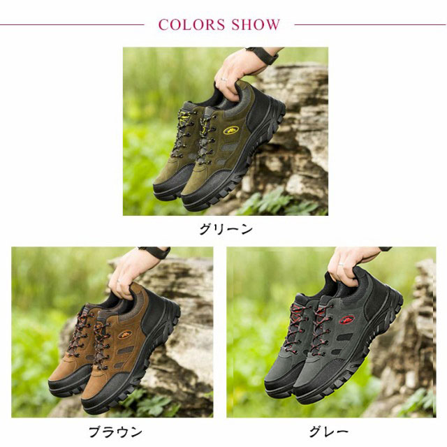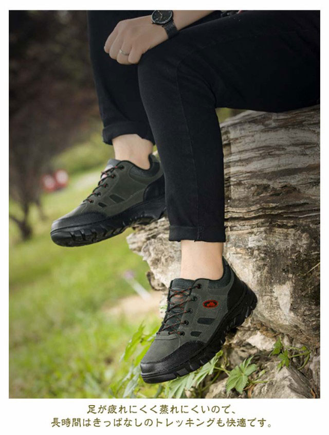 | 【トレッキングシューズ】【撥水・通気性】【24.5〜27.5cm】 【散歩や旅行などのタウンユースに】 ローカットなので、普段履きとしても違和感のないデザインです。 長時間でも疲れにくく、水にも強いので 登山だけではなく普段の外出や旅行にもおすすめです。 【キャンプやアウトドアに】 しっかり足を保護するトレッキングシューズなら、キャンプ場のような未舗装の場所でも歩きやすく、怪我の防止にもなります。 はっ水、防汚加工と防水加工で、水たまりや泥道でも安心です。 【トレッキングに】 街中と違って傾斜のある岩や土の上を歩く登山では、専用の靴が必須。 土の上でも滑りにくく、軽くてクッション性もあるので 一日中歩いても疲れにくい。 【疲れにくい】 ハニカム構造のインソールが、衝撃を分散させて、疲労を軽減。 穴から湿気が抜けるので、足が蒸れにくい効果もあります。 足が疲れにくく蒸れにくいので、長時間はきっぱなしのトレッキングも快適です。 | |