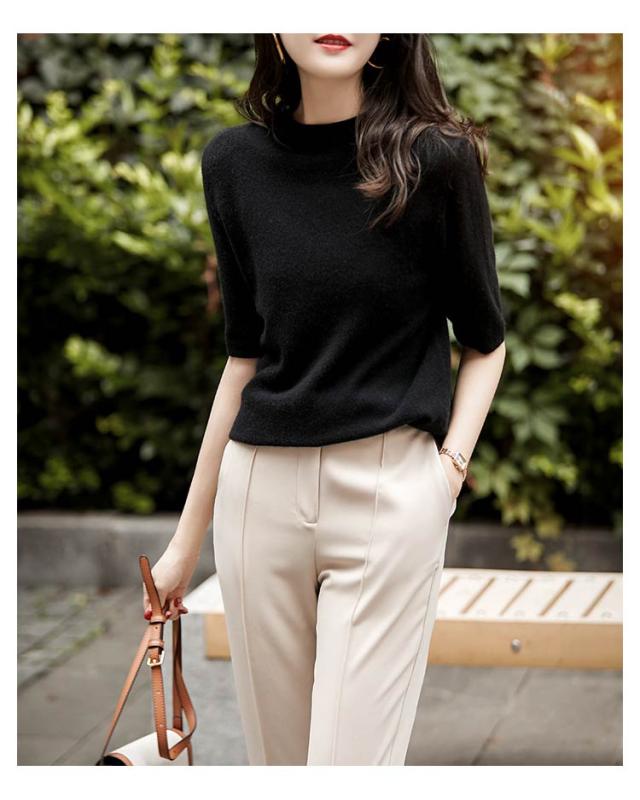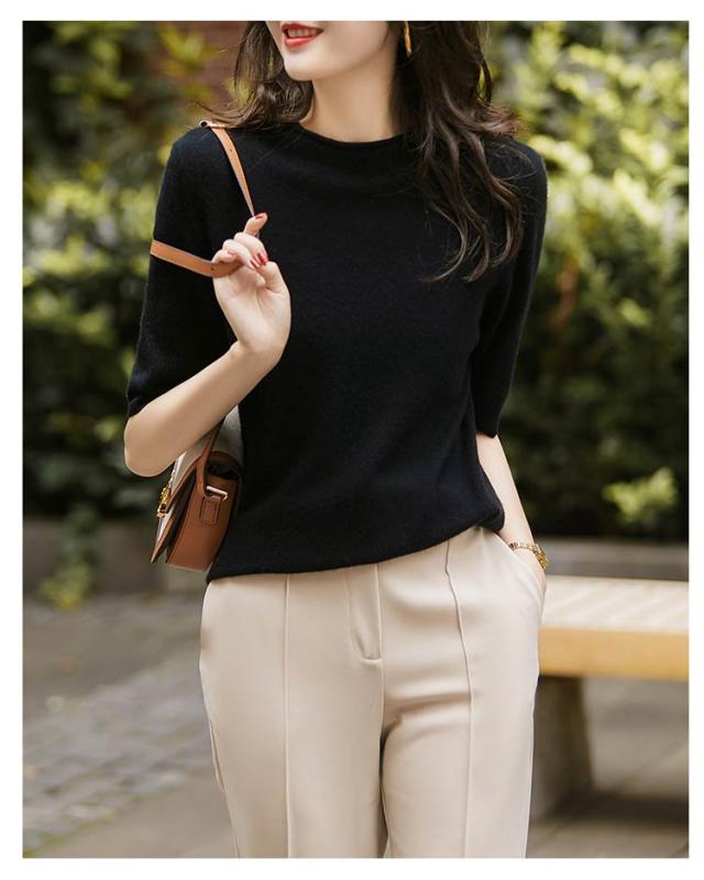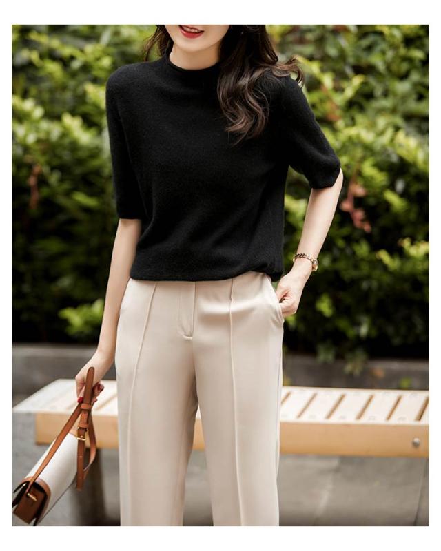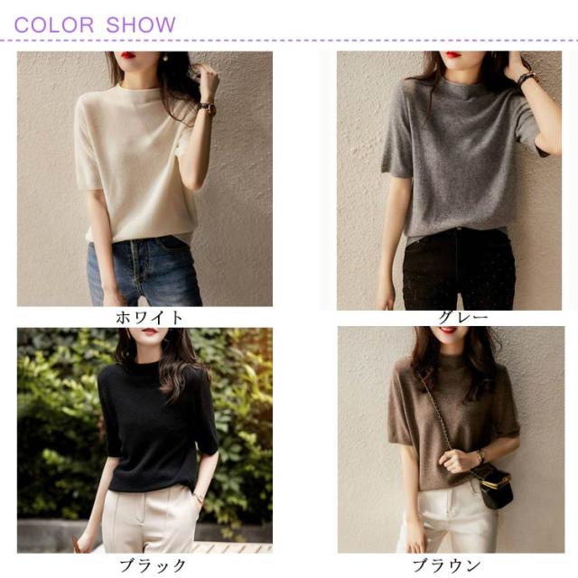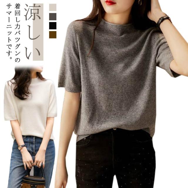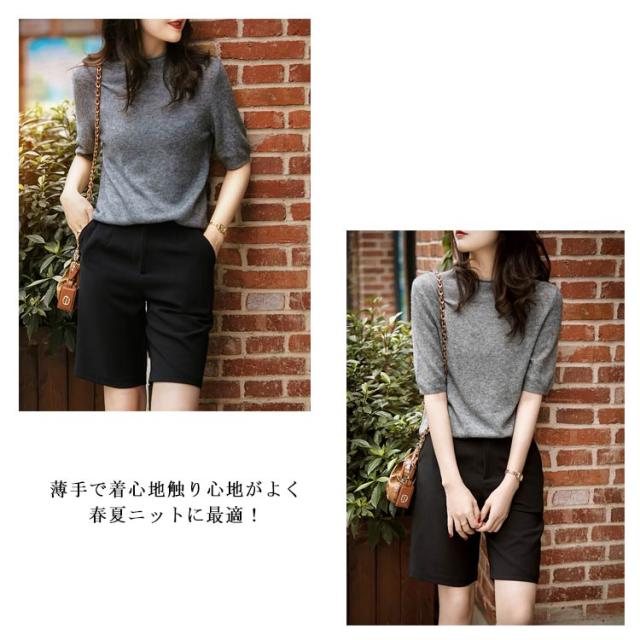 サマーニット 半袖 ハイゲージニット Tシャツ カットソー 秋 丸首 リブ編み ラウンドネック レディース トップス ホワイト グレー ブラック ブラウン 涼しい 無地 冷房対策 tシャツ ブラウス