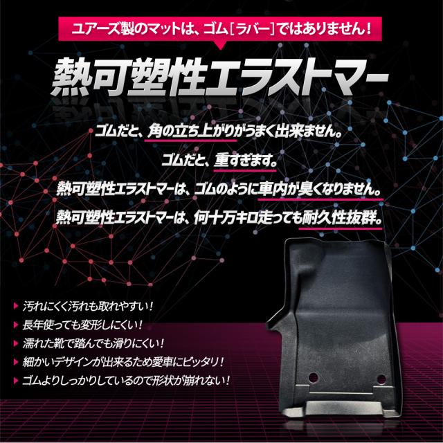 ・フロアをスキャンして製作しているのでピッタリフィット! ・マットの一部には付属のマジックテープで車体と固定するのでマットは全くズレません! ■純正マットの端から落ちるゴミや砂をガッチリガード!! ・隙間なくフィットするので、ゴミや砂が直接車両床に落ちることはありません。 ・3Dデザインなので縁の数センチの立ち上がりで水や汚れをしっかりキャッチ! ■完全防水なのでお手入れも簡単! ・水や汚れは軽いものならウエスなどで拭くだけでOK! ・全面的に汚れた場合は丸洗いも可能なので衛生的です。 ■新素材の熱可塑性エラストマー(TPE)を使用。 ・弾力があり、曲げたりすることも可能なので、お車からの取り外しも容易です。 ・ゴムのように車内が臭くなりません。 ・耐久性抜群なので何十万キロ走っても大丈夫です。 |