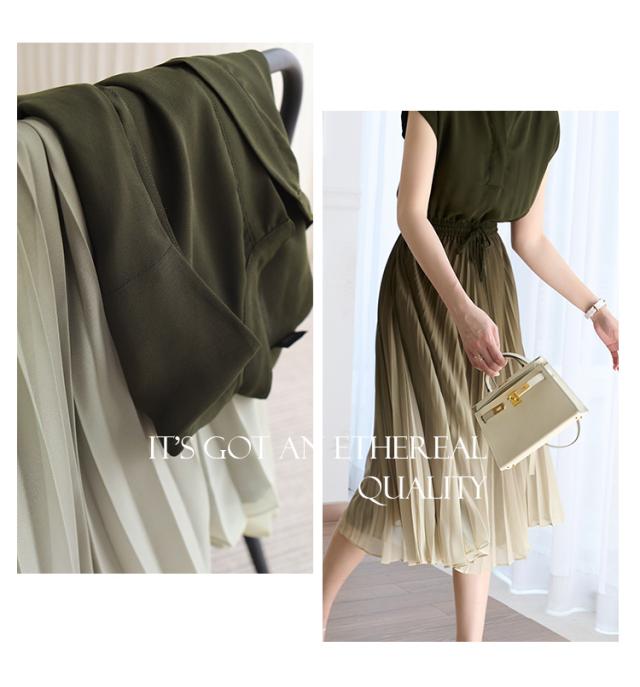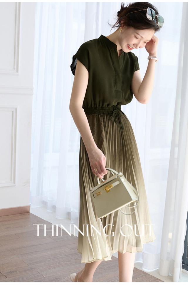 グラデーション プリーツ ロング ワンピース フレアワンピース 膝下 ミモレ ミモレ丈 ロング丈 袖あり フレンチスリーブ Vネック スキッパー フレア Aライン ウエストリボン ウエストゴム 透け感 かわいい 大人可愛い きれいめ シンプル カジュアル 大人 上品 おしゃれ 大人女子 ラブリー モード系 エレガント モダン とろみ感 抜け感 無地 夏 10代 20代 30代 40代 50代 60代 オフィス ビジネス OL 通勤 学生 通学 デート お出かけ 休日 着回し 普段使い 楽ちん 体系カバー