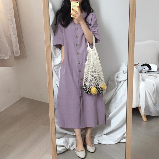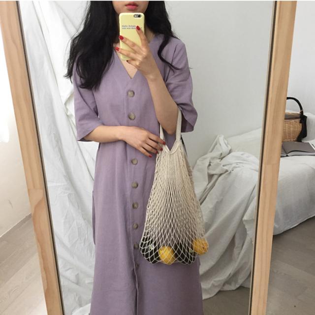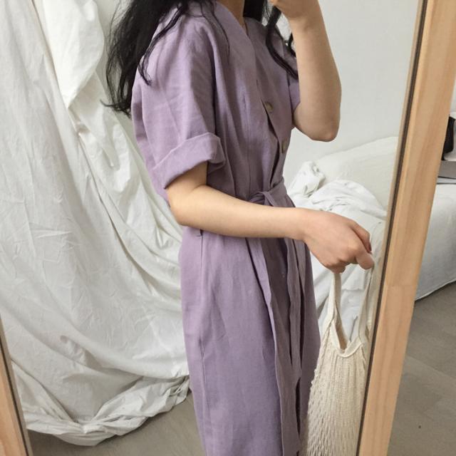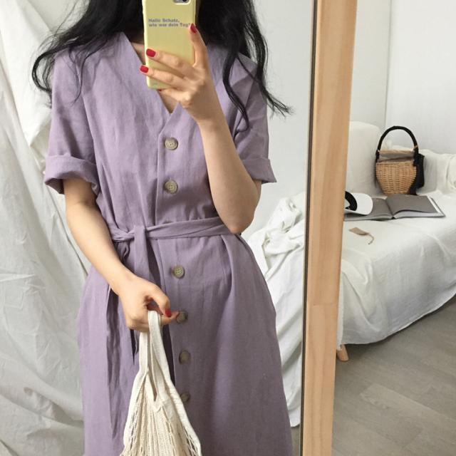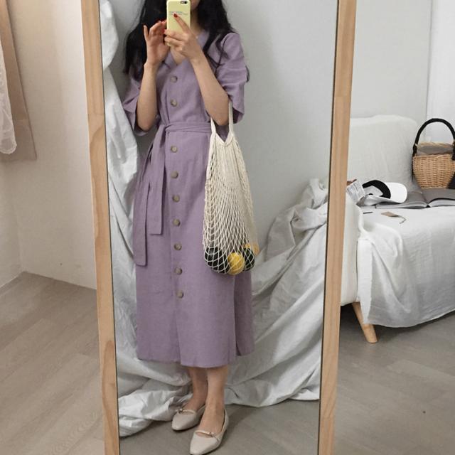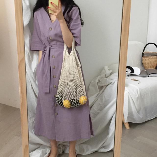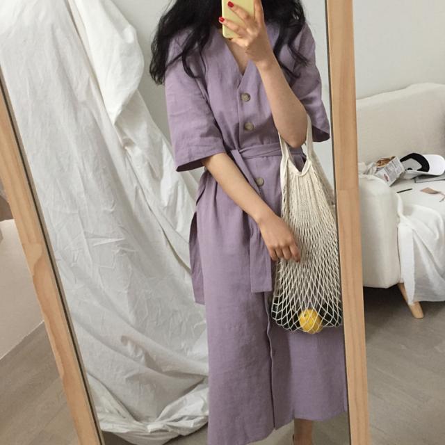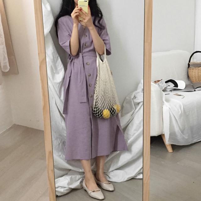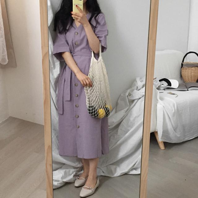 ワンピース ワンピドレス 膝下 ロング ロング丈 袖あり 半袖 Vネック 襟なし Aライン リボン ウエストリボン ハイウエスト 前開き かわいい 大人可愛い シンプル カジュアル 大人 上品 おしゃれ お洒落 アジアン エスニック エキゾチック 大人女子 こなれ感 ラフ 無地 夏 10代 20代 レディース 女性用 通勤 デート お出かけ 公園デビュー 女子会 お泊まり 休日 リゾート 旅行 海 ホテル ガーデン レストラン 普段使い 楽ちん サイズ フリーサイズ 色展開 紫 パープル