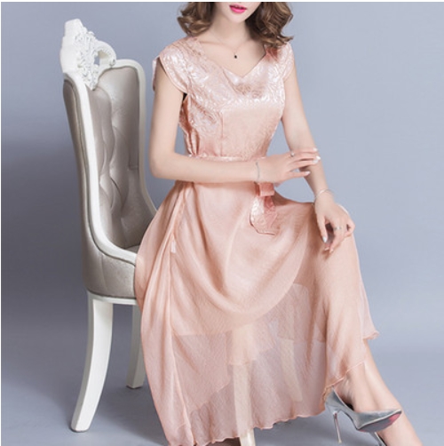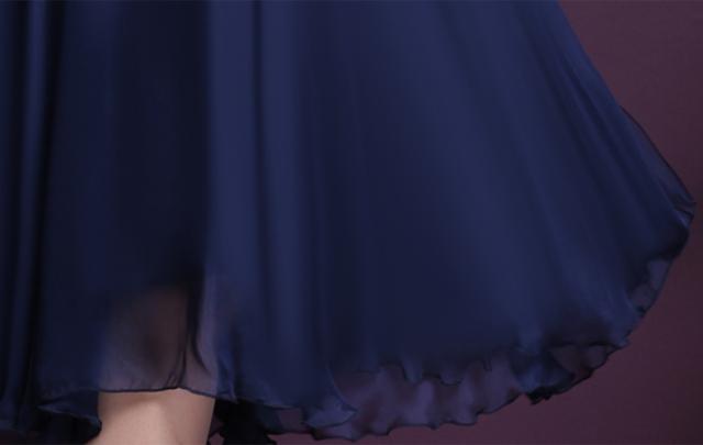 繊細な柄と軽やかなシフォンスカートの組み合わせが目を引くデザインです。