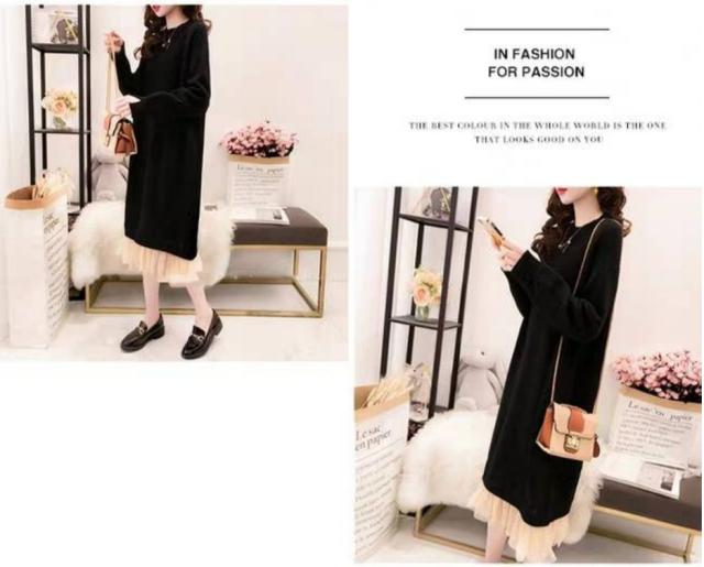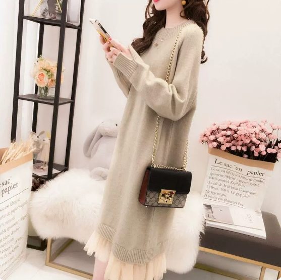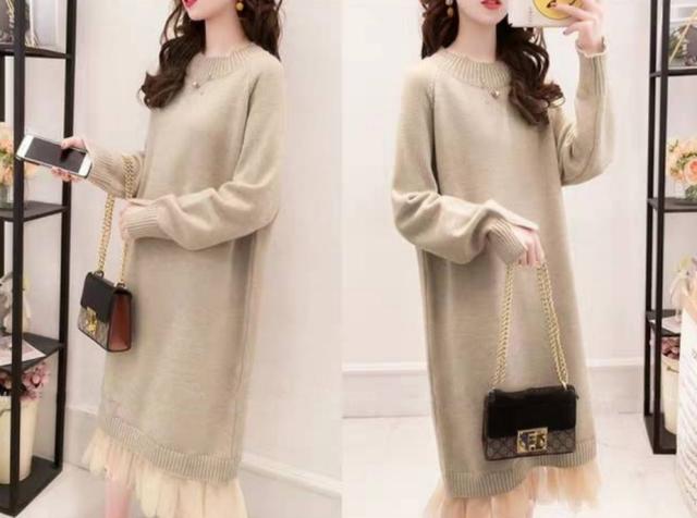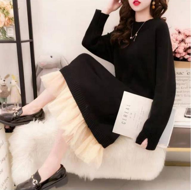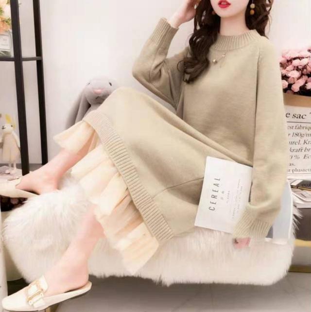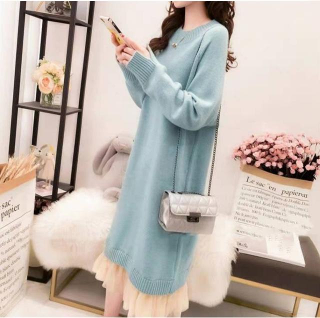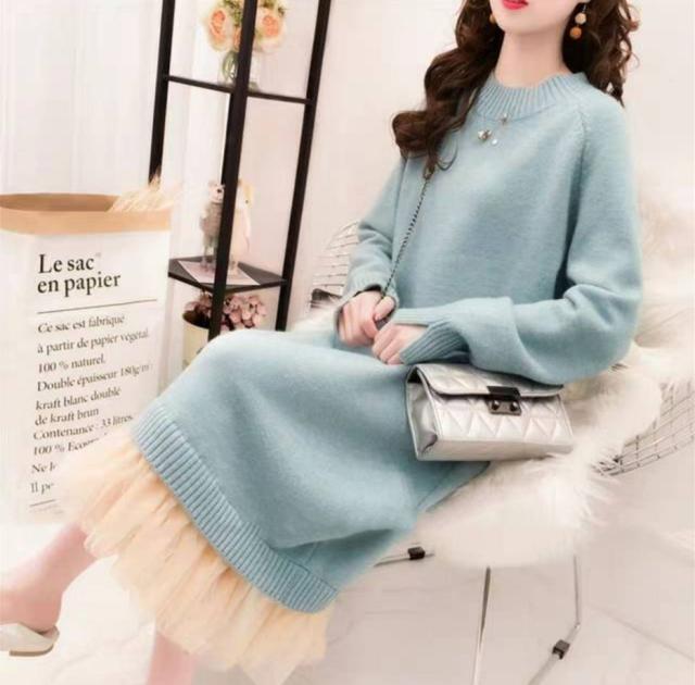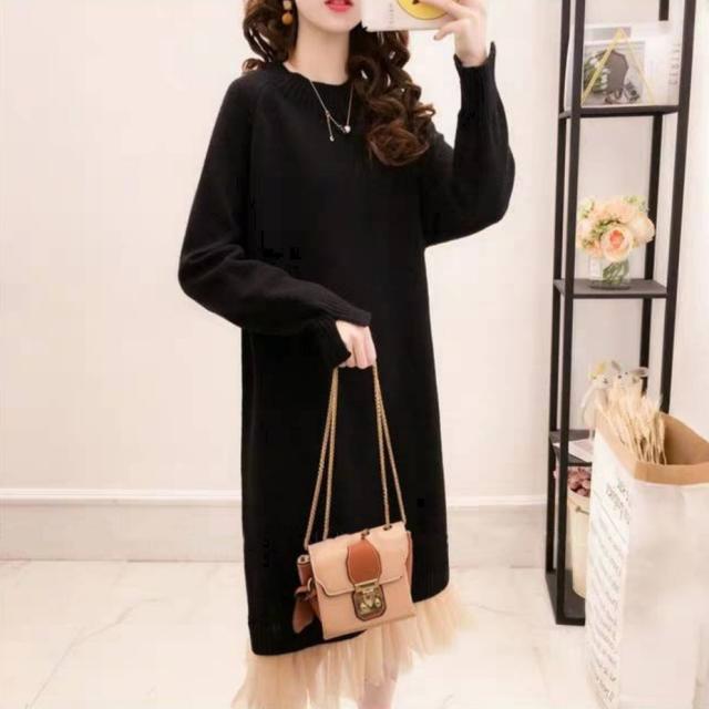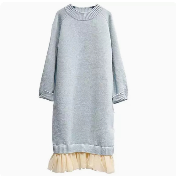 ニットワンピース 裾チュール ドッキング ワンピース セーター ワンピドレス 膝下 ミモレ丈 ロング丈 袖あり 長袖 袖スリット クルーネック Iライン 切り替えデザイン チュール シフォン ニット かわいい おしゃれ お洒落 大人女子 ラブリー キュート 春 秋 冬 クリスマス バレンタイン 10代 20代 30代 ママ OL 学生 通学 デート お出かけ 休日 旅行 ホテル レストラン 暖かい モテ M L XL 2XL 3XL 色展開 黒 ブラック ブルー ベージュ カーキ 水色 ライトブルー