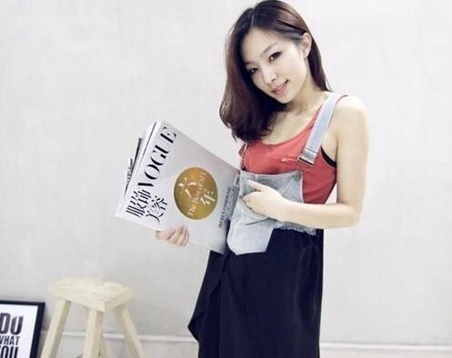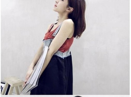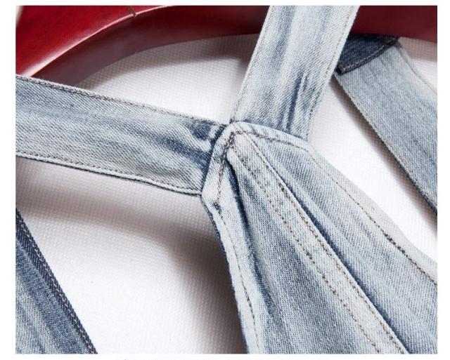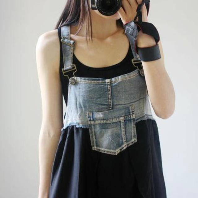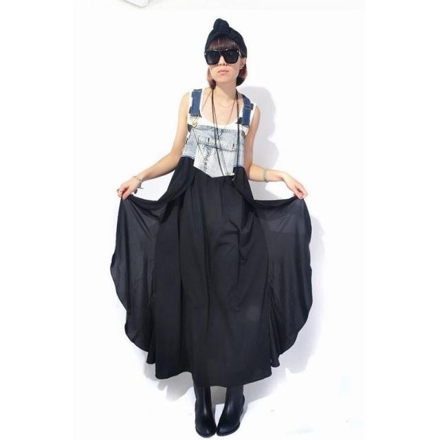 デニム風の生地とシフォンスカートのドッキングがおしゃれなサロペットワンピです。