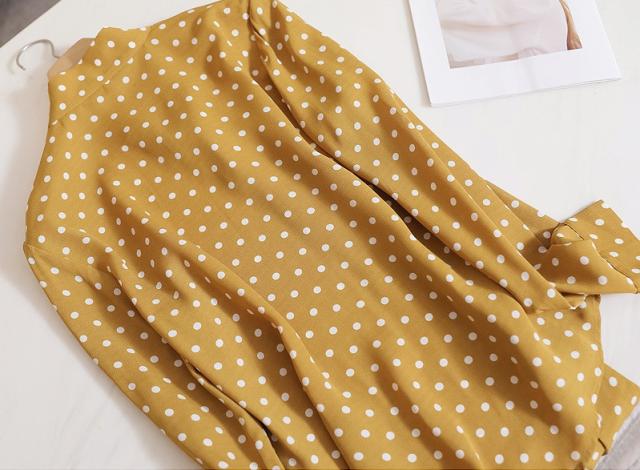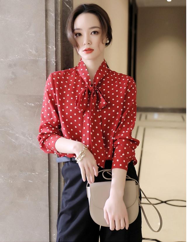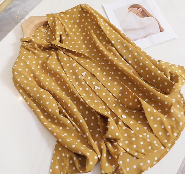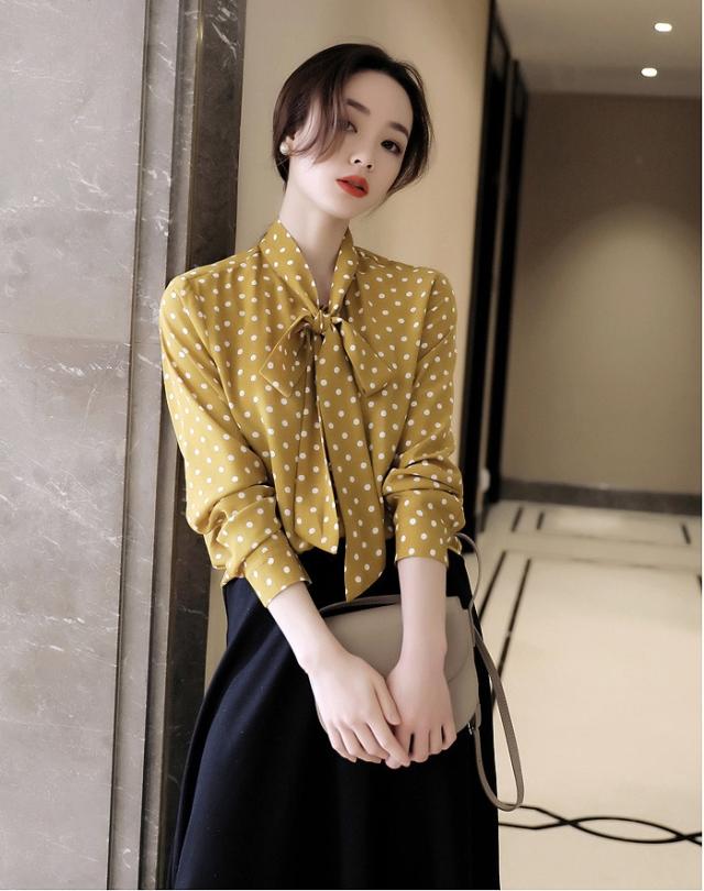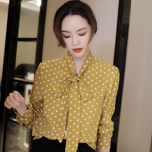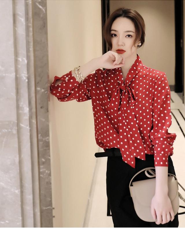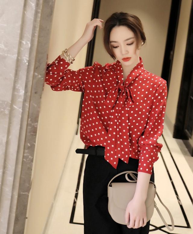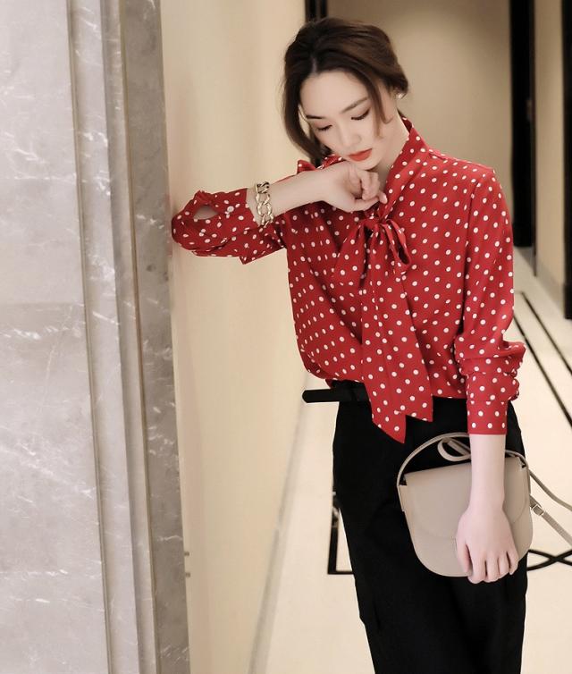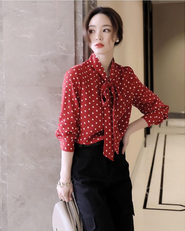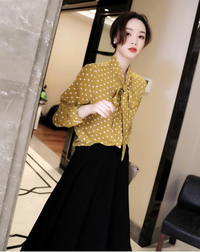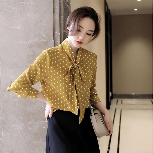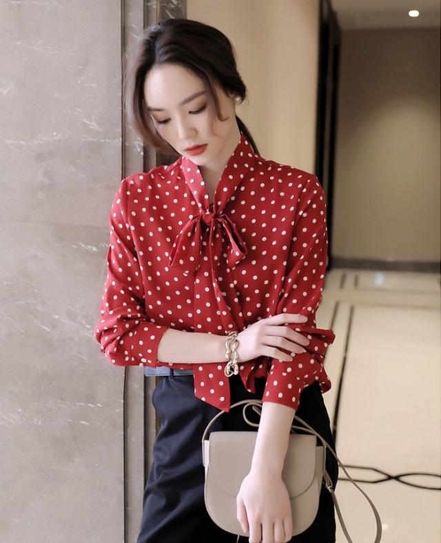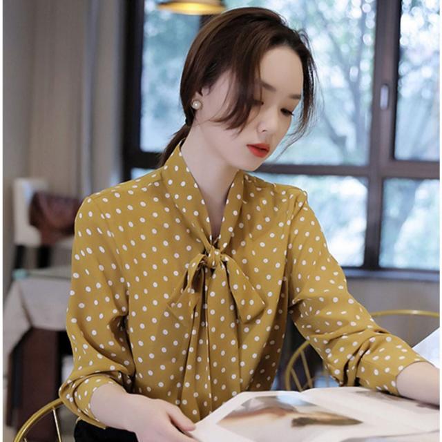 ボウタイ とろみ ブラウス トップス シャツ 袖あり 長袖 リボン 前開き かわいい 大人可愛い きれいめ カジュアル 大人 上品 おしゃれ 大人女子 こなれ感 ラブリー キュート モード系 エレガント モダン 主役級 存在感 フォーマル とろみ感 柄 ドット柄 水玉 春 夏 秋 冬 10代