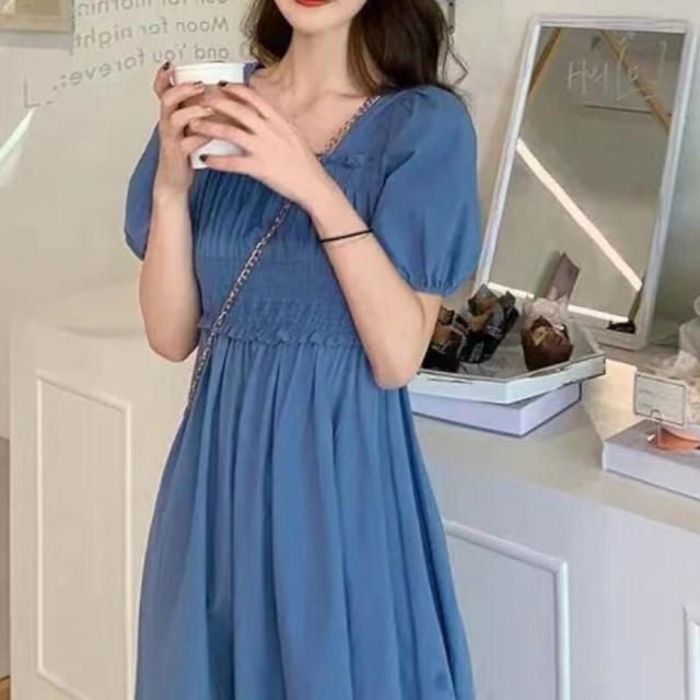 ワンピース ミドル丈 袖あり 半袖 スクエアネック Aライン ハイウエスト シャーリング かわいい 大人可愛い きれいめ シンプル カジュアル おしゃれ お洒落 レトロ こなれ感 ラブリー キュート エレガント とろみ感 抜け感 無地 春 夏 10代 20代 30代 40代 女性用 デート