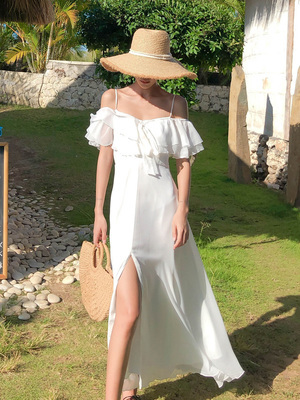 オフショル センタースリット フレア ワンピース フレアワンピース ロング ロング丈 マキシ マキシ丈 9分丈 アンクル丈 オフショルダー Aライン フリル スリット ハイウエスト かわいい 大人可愛い きれいめ シンプル カジュアル 大人 上品 おしゃれ 大人女子 こなれ感