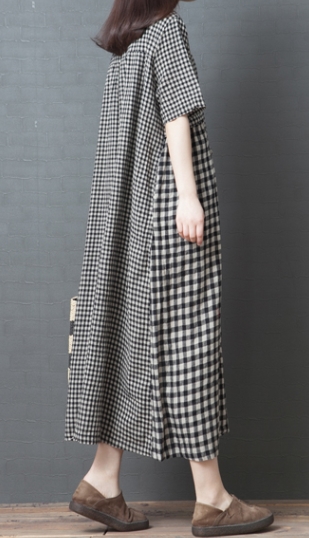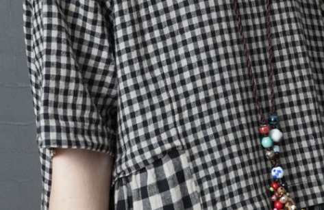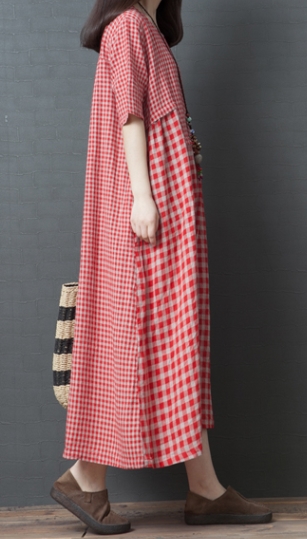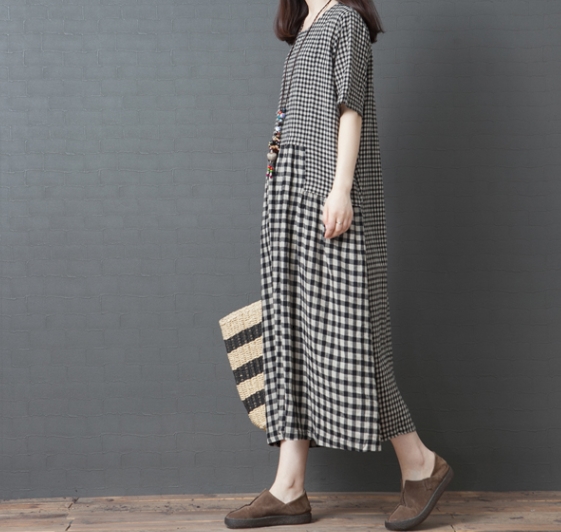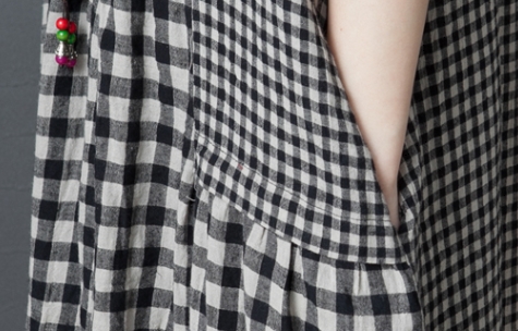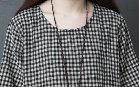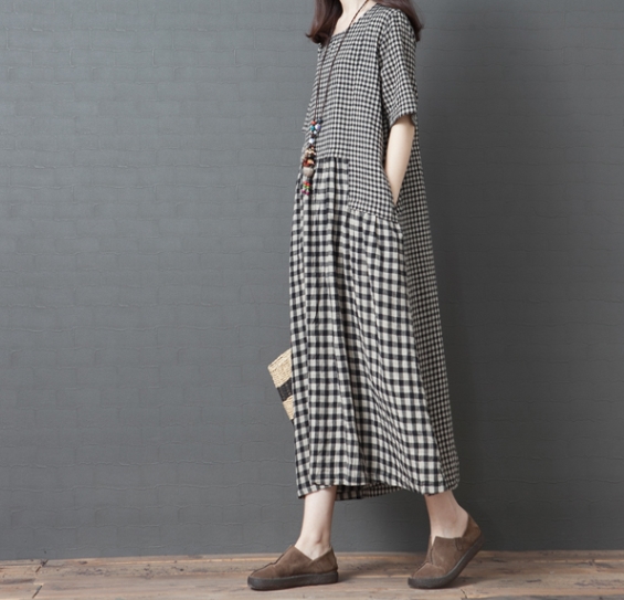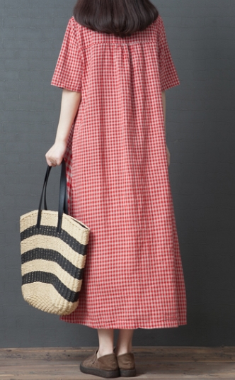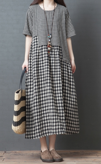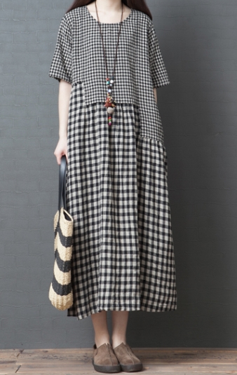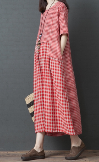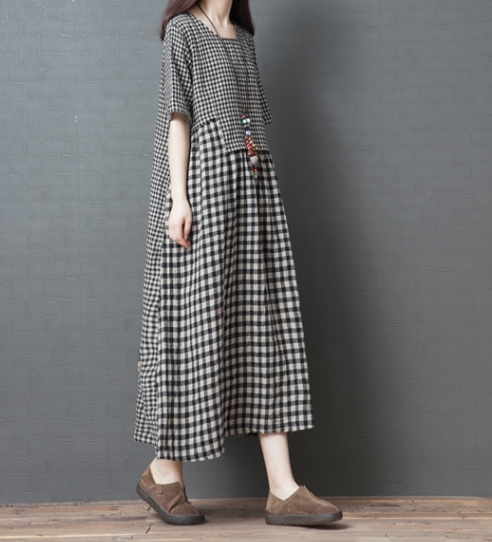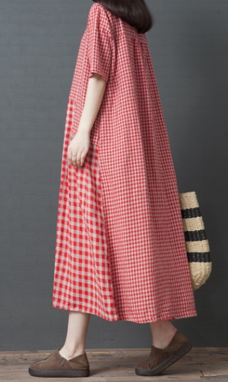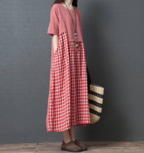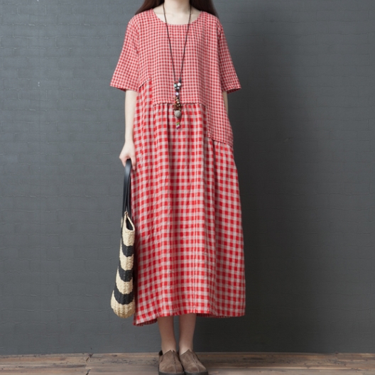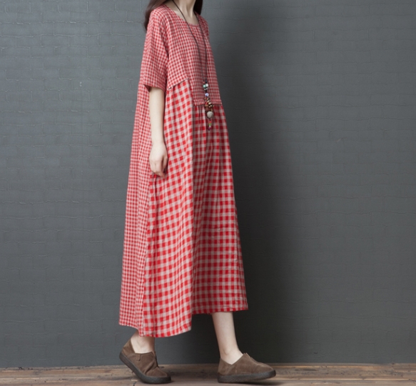 ワンピース ワンピドレス 膝下 ロング ロング丈 袖あり 半袖 ラウンドネック 襟なし Aライン 切り替えデザイン ポケット 綿 リネン かわいい 大人可愛い シンプル カジュアル 大人 おしゃれ レトロ アジアン エスニック エキゾチック ラフ 柄 格子柄 夏 秋 20代 30代 40代