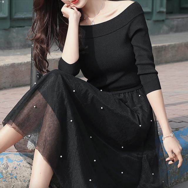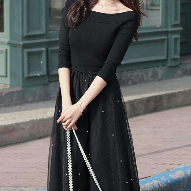 スカートのパールデザインがおしゃれなフレアワンピース。
