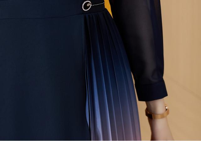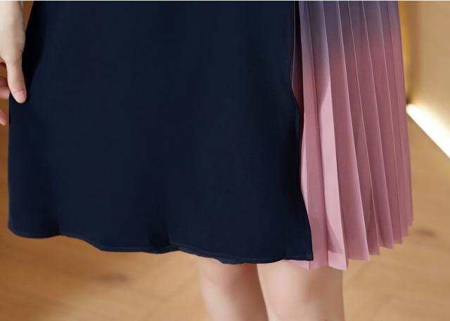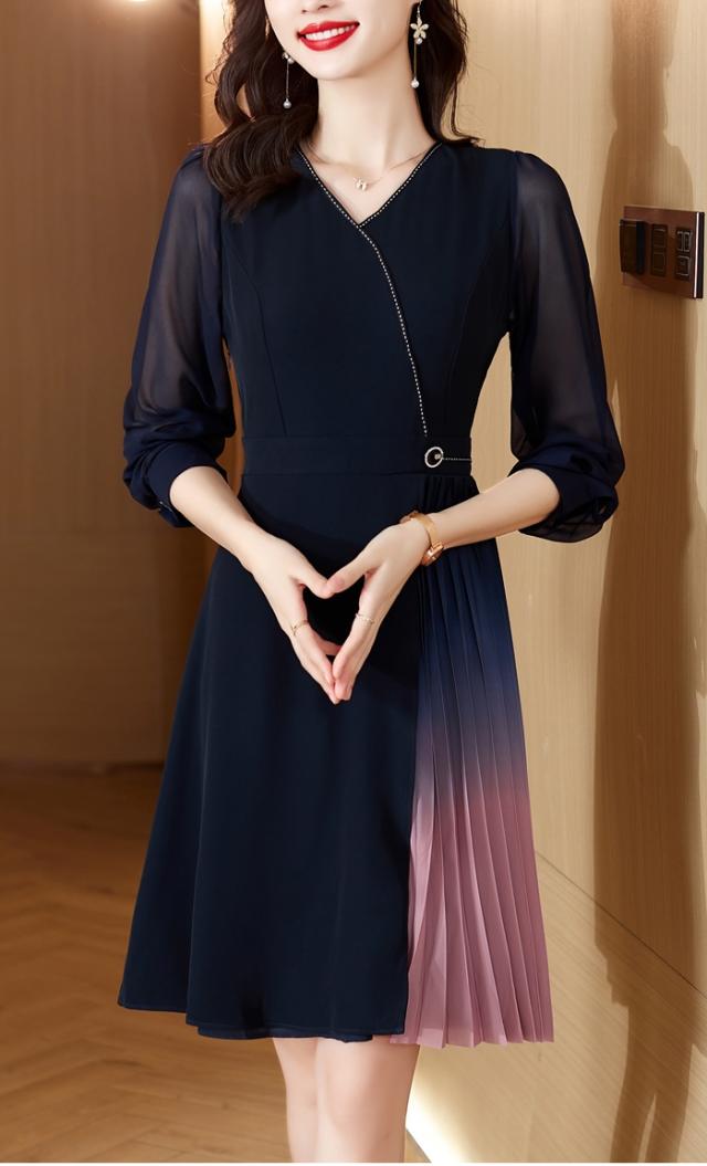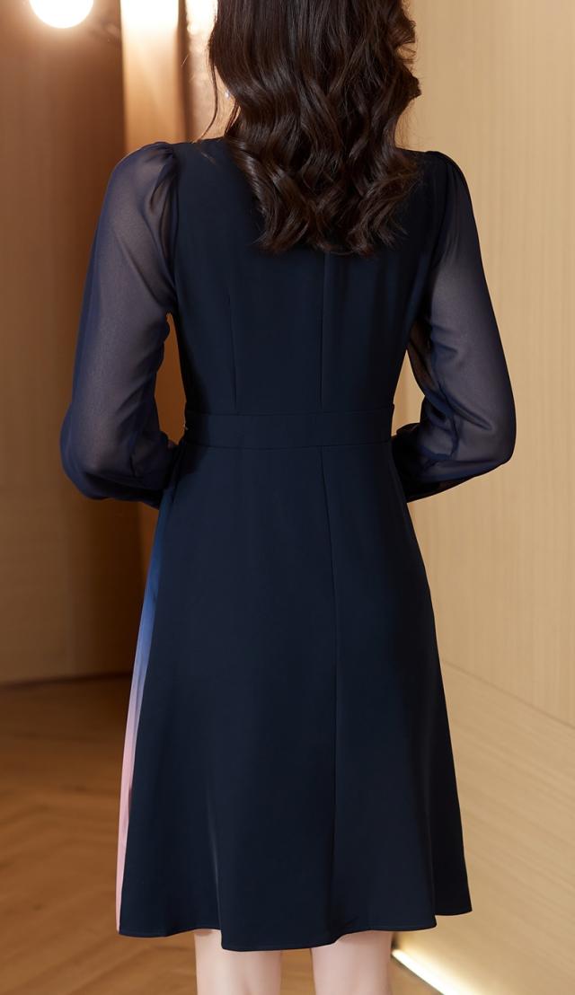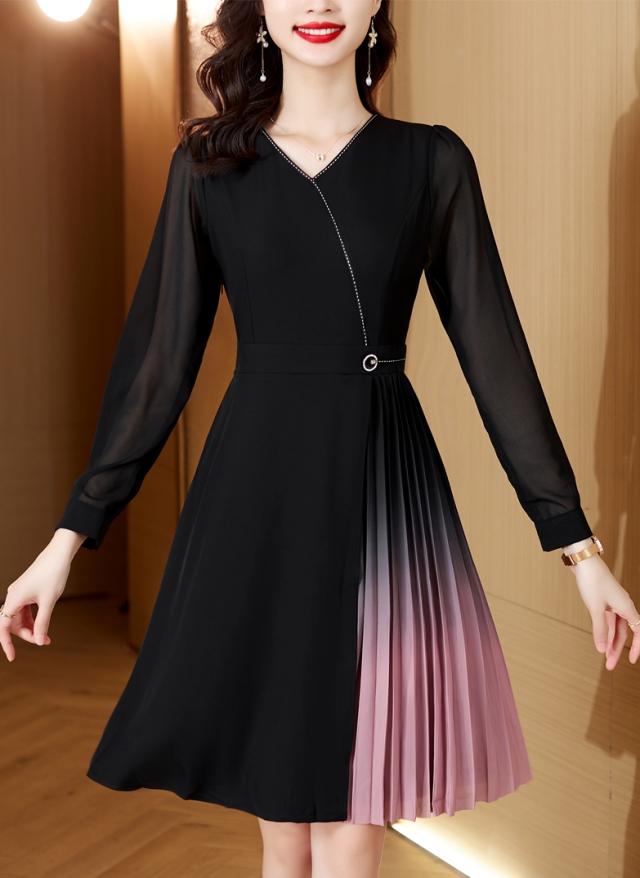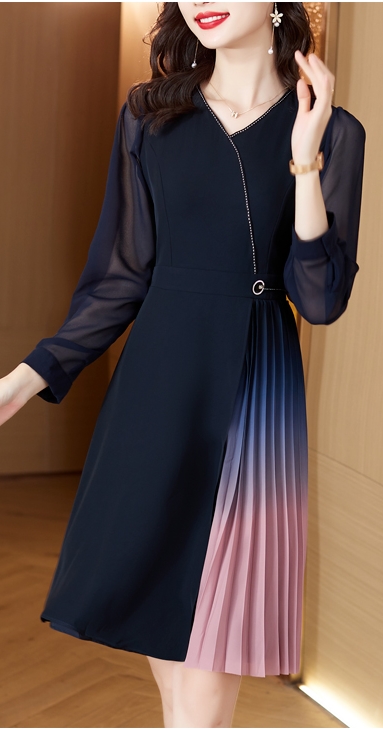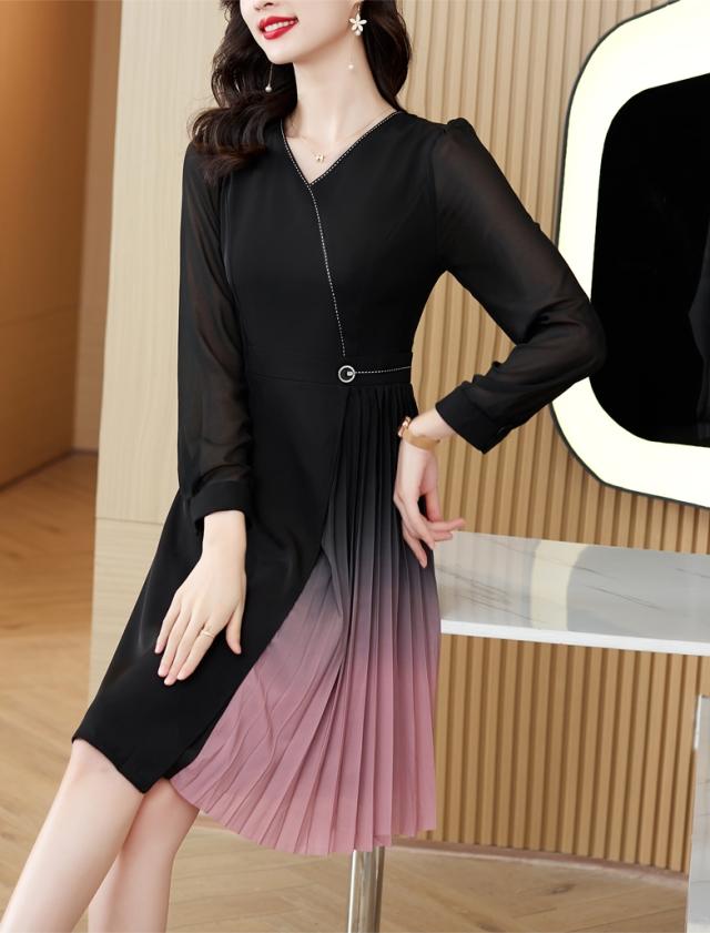 目を引く美しいグラデーションのドッキングプリーツが華やかなワンピです。