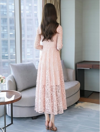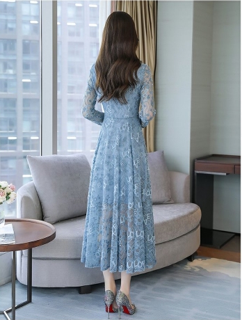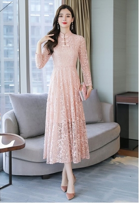 チャイナボタン レース フレア ドレス ワンピース パーティードレス パーティドレス 結婚式ドレス 結婚式のドレス ロング ロング丈 マキシ マキシ丈 袖あり 長袖 ハイネック マオカラー Aライン プリーツ 刺繍 シフォン ハイウエスト 透け感 シースルー かわいい 大人可愛い