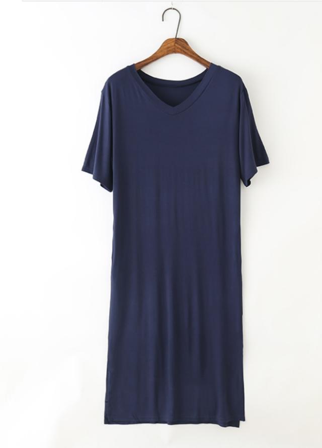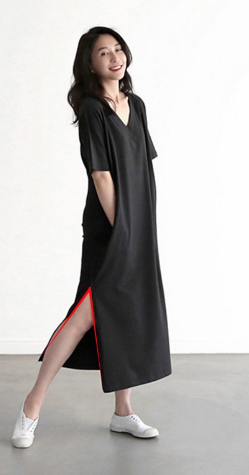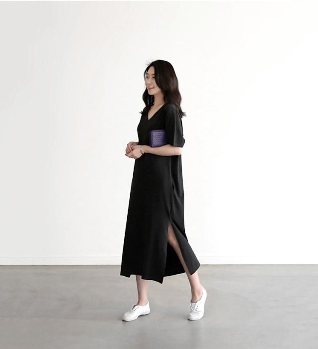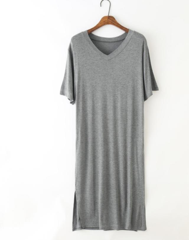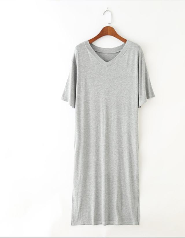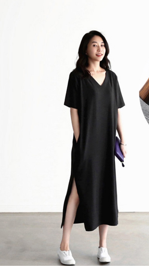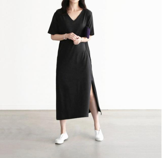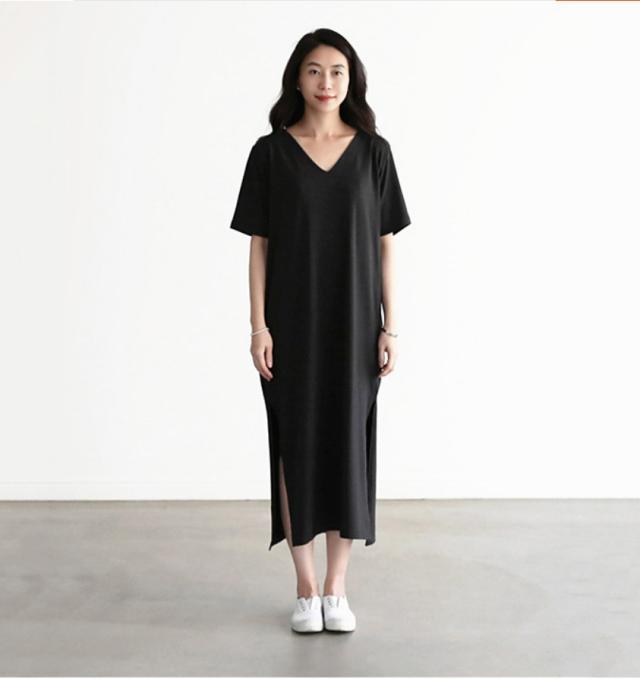 Tシャツワンピース ワンピース チュニック 部屋着 膝下 ミモレ ミモレ丈 ミディアム丈 袖あり 半袖 Vネック Iライン サイドスリット シンプル カジュアル おしゃれ お洒落 ラフ スポーティー 無地 春 夏 秋 シーズンレス 10代 20代 30代 40代 50代 60代 ママ マタニティ