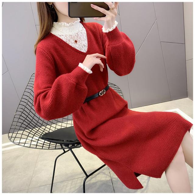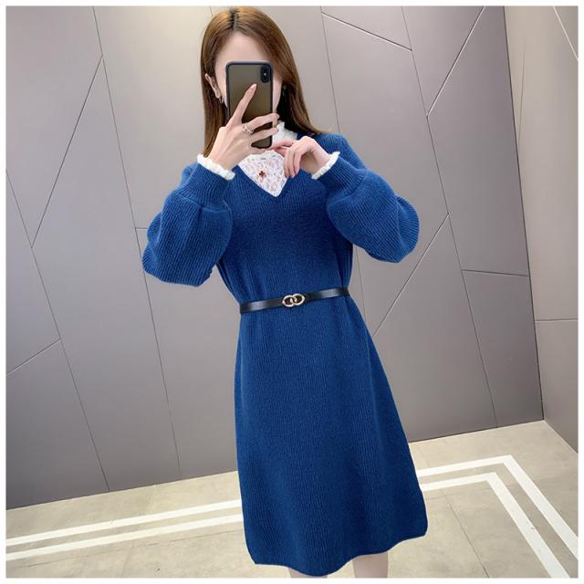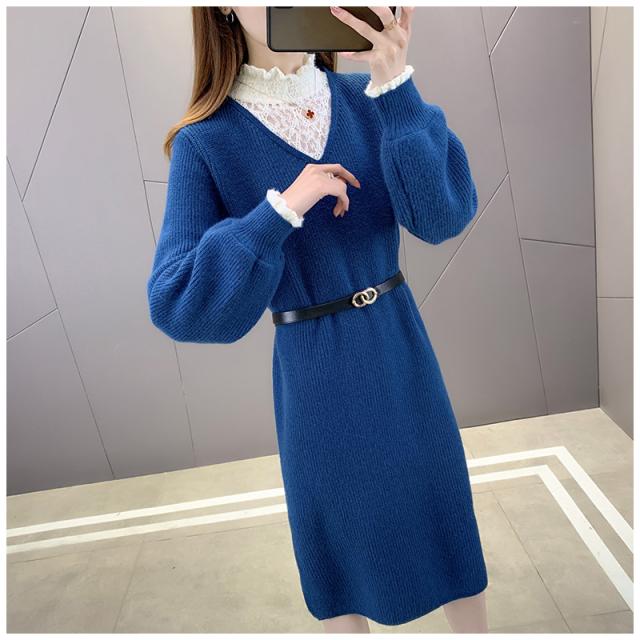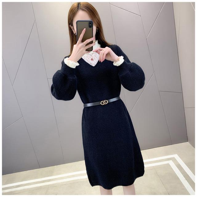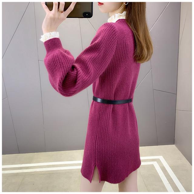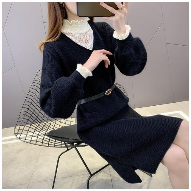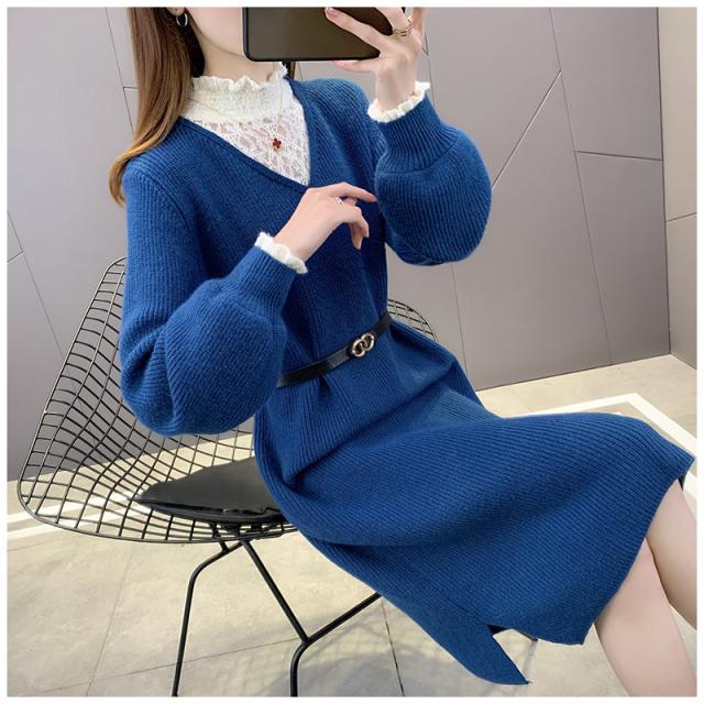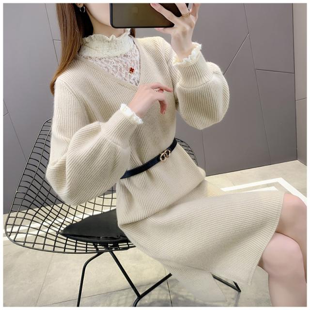ニットワンピース ドッキングワンピ 上品ワンピ フェイクレイヤードワンピ ワンピース ブラウス ニット 膝丈 ひざ丈 膝上 袖あり 長袖 ボリューム袖 Vネック ハイネック フリルネック フレア ドッキング フェイクレイヤード ツーピース風 フェイクツーピース レース