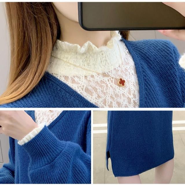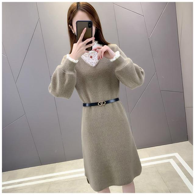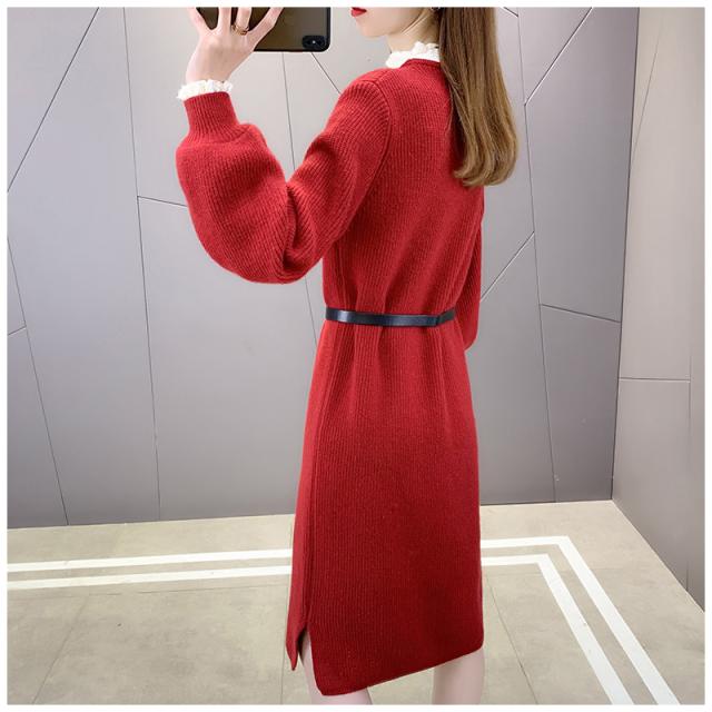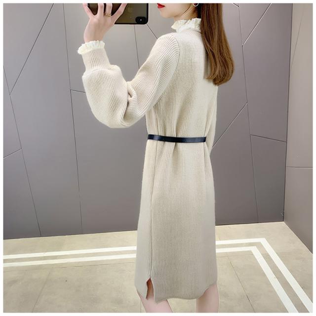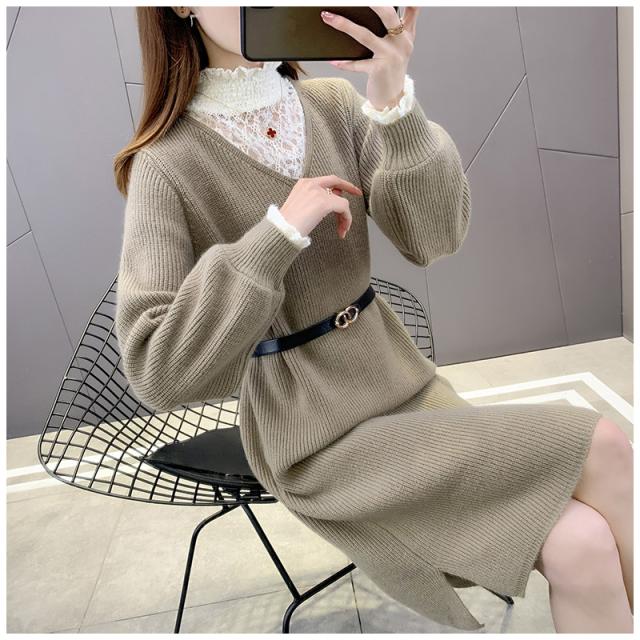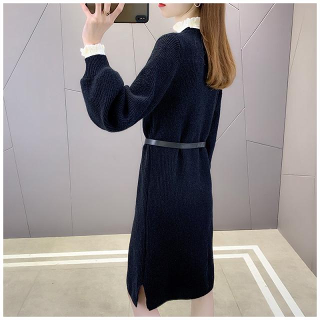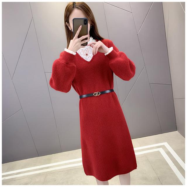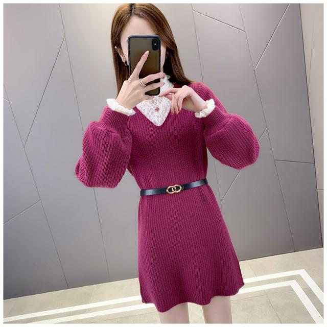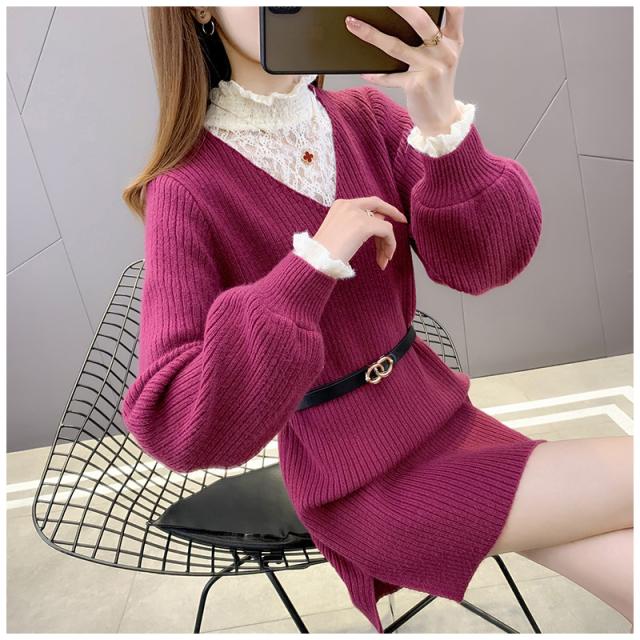 ニットワンピース ドッキングワンピ 上品ワンピ フェイクレイヤードワンピ ワンピース ブラウス ニット 膝丈 ひざ丈 膝上 袖あり 長袖 ボリューム袖 Vネック ハイネック フリルネック フレア ドッキング フェイクレイヤード ツーピース風 フェイクツーピース レース