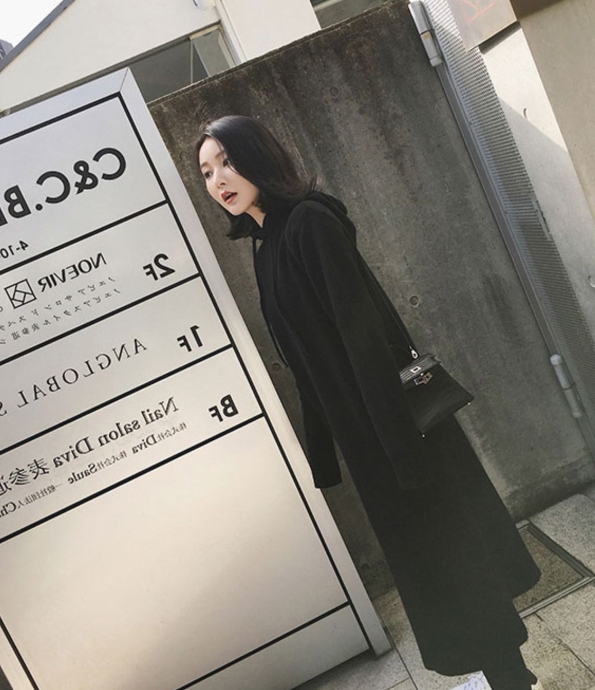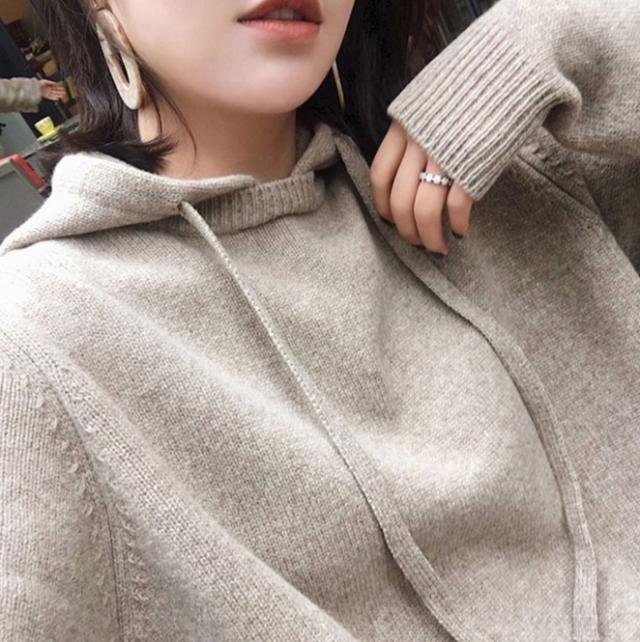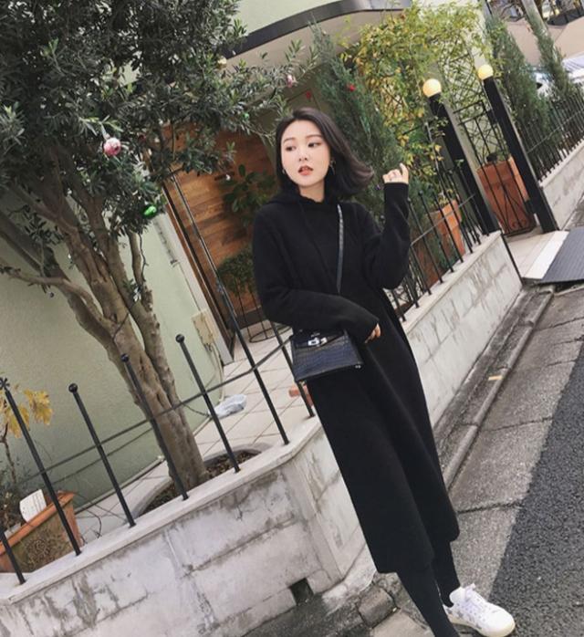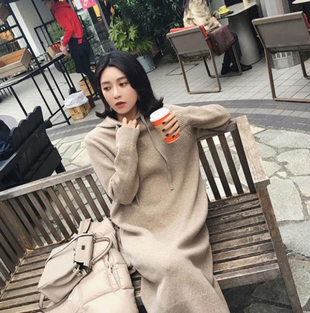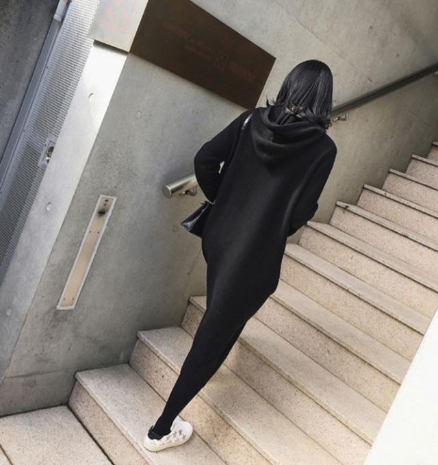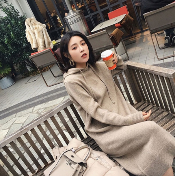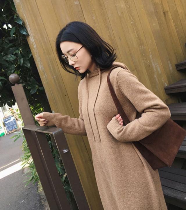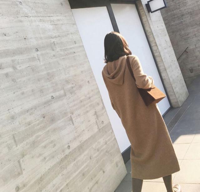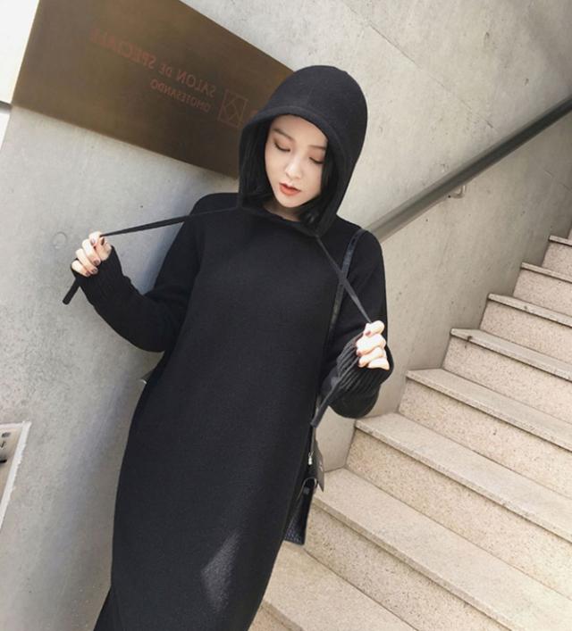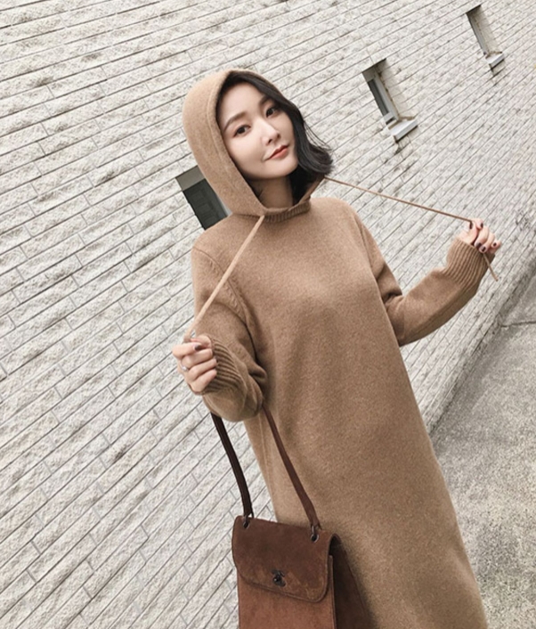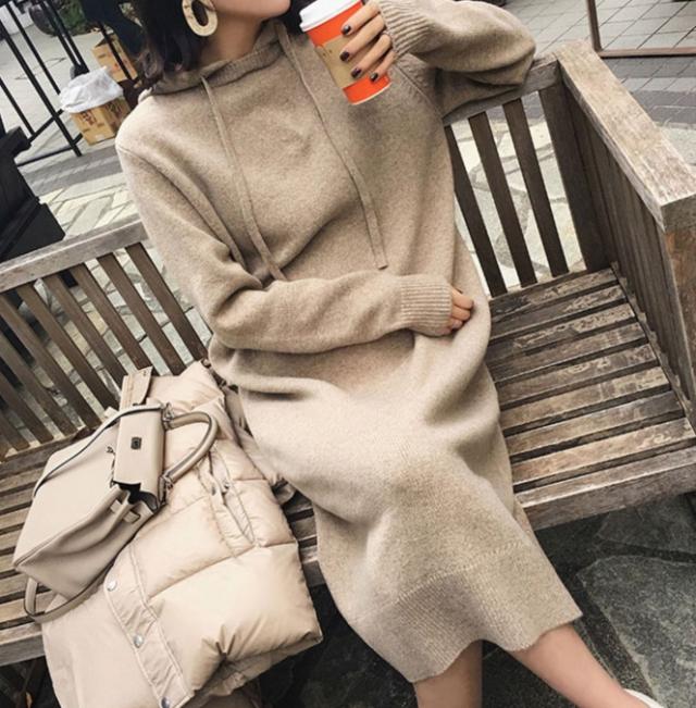 秋冬の時期に、ゆったり着られる、フード付きのワンピース。