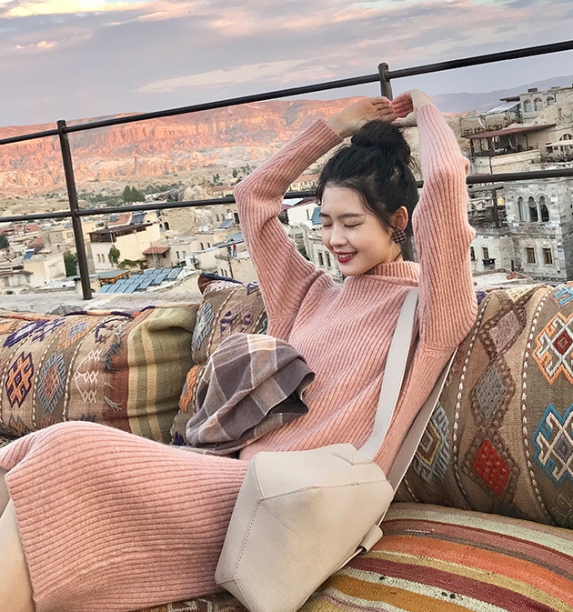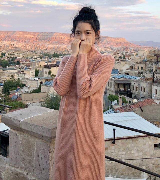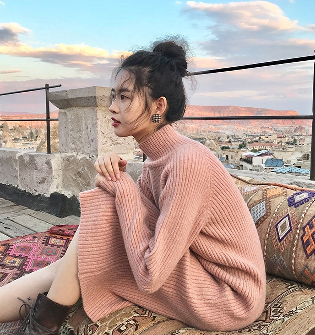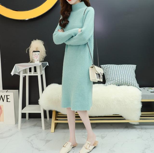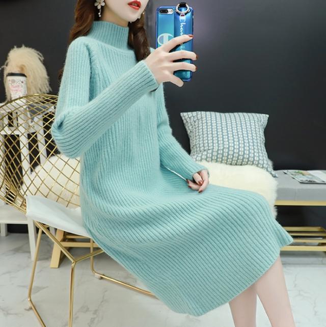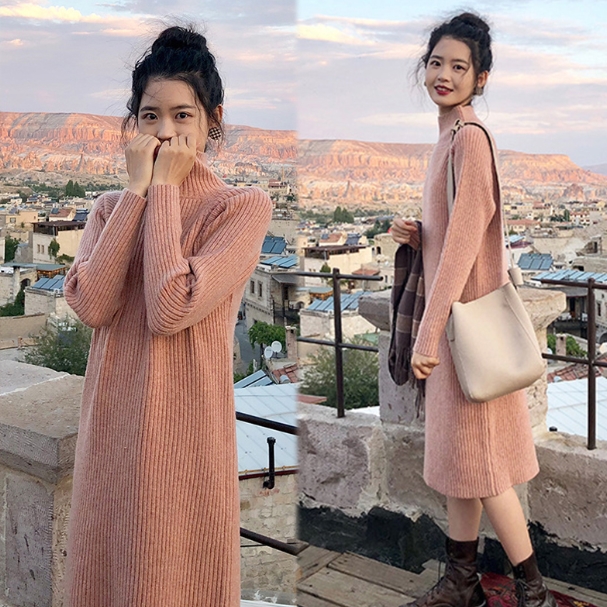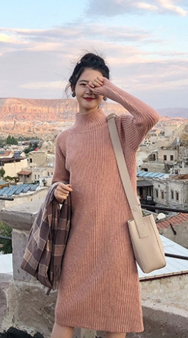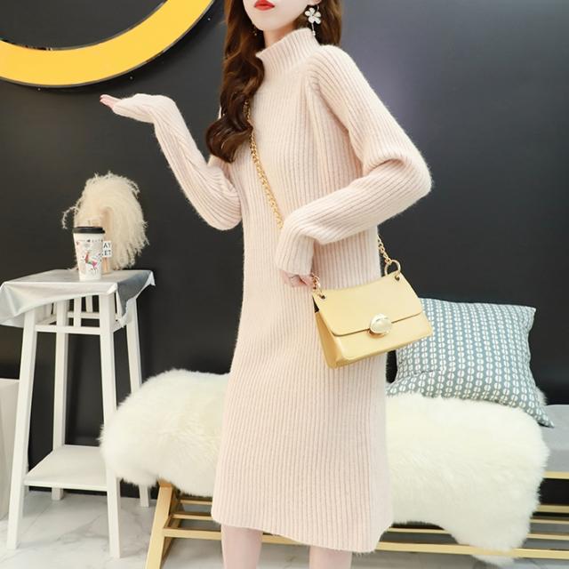 ワンピース ワンピドレス 膝下 袖あり 長袖 ハイネック タートルネック 襟なし ストレート Iライン リブ リブニット ニット かわいい 大人可愛い シンプル カジュアル 大人 おしゃれ お洒落 アジアン エスニック 大人女子 ラフ 無地 秋 冬 10代 20代 レディース 女性用 通勤