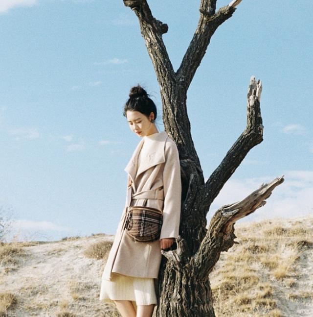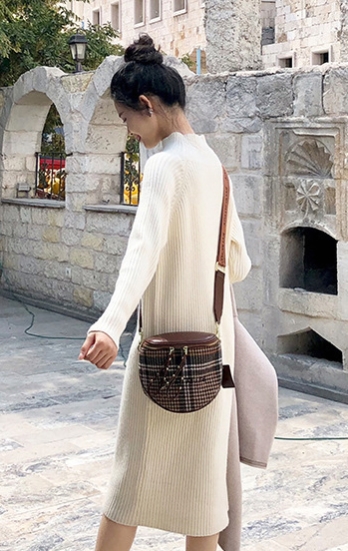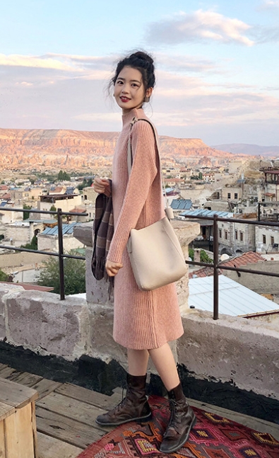 大人可愛い色味とデザインの、ニットワンピース。