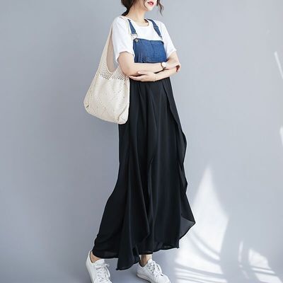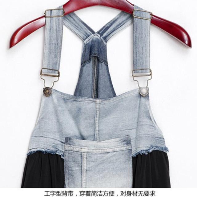 デニムとフレアスカートのドッキングデザインがスタイリッシュなサロペットワンピ。