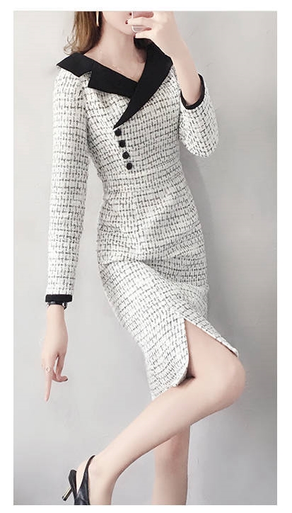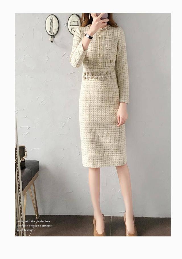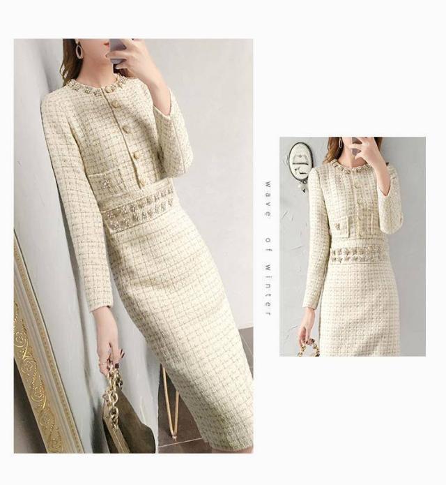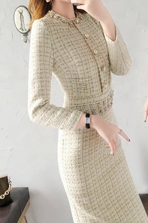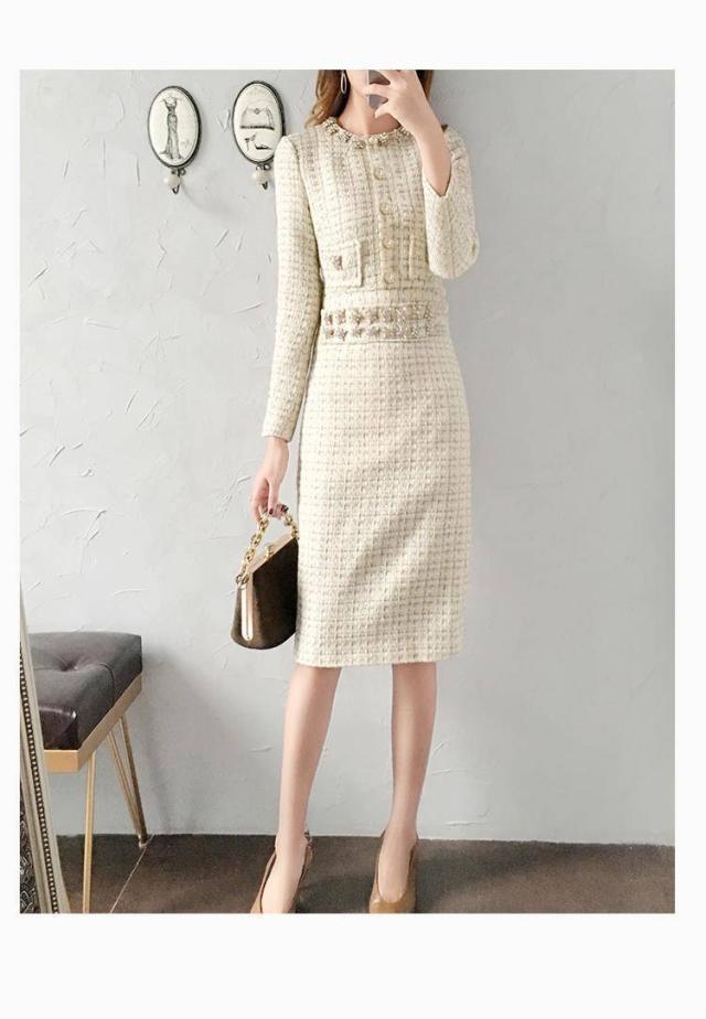 ジャケットワンピース ワンピース ジャケット ペンシルスカート タイトスカート コートワンピース 膝丈 ひざ丈 膝上 長袖 ラウンドネック 襟付き スリム 細身 ウエストマーク サイドスリット ドッキング ビジューつき パールボタン ツイード きれいめ 大人 上品 おしゃれ