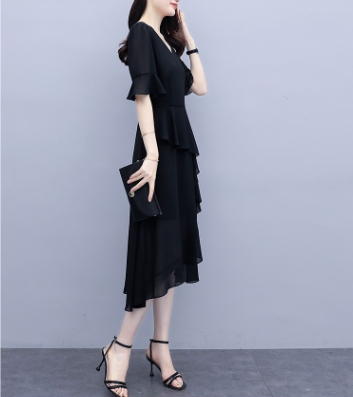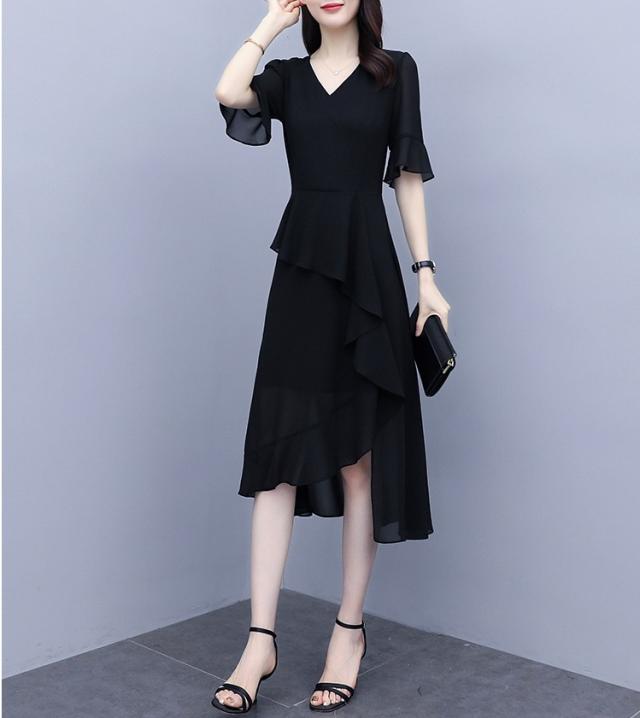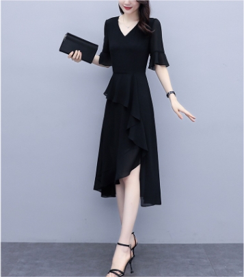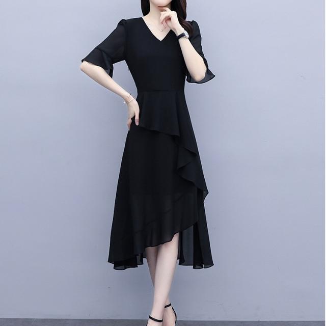 アシンメトリー ティアード 半袖 フォーマル ドレス パーティードレス パーティドレス 結婚式ドレス 結婚式のドレス ミモレ ミモレ丈 袖あり 5分袖 五分袖 フレアスリーブ Vネック Aライン フレア シフォン 透け感 大人可愛い きれいめ シンプル 大人 上品 おしゃれ 大人女子