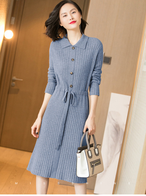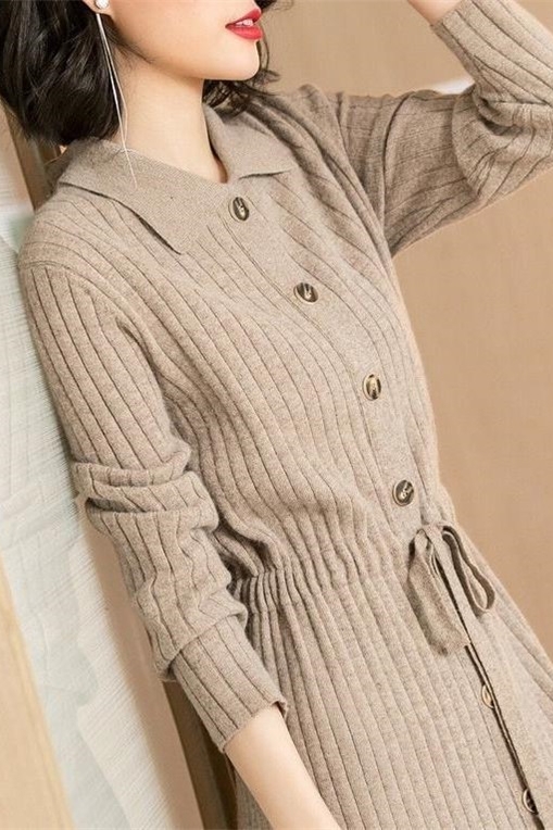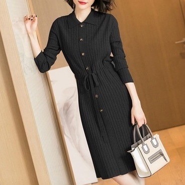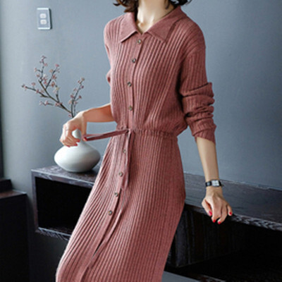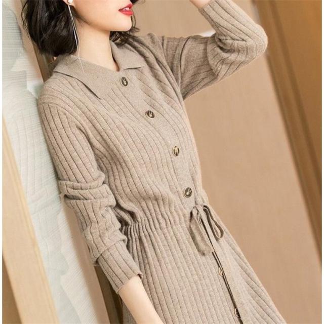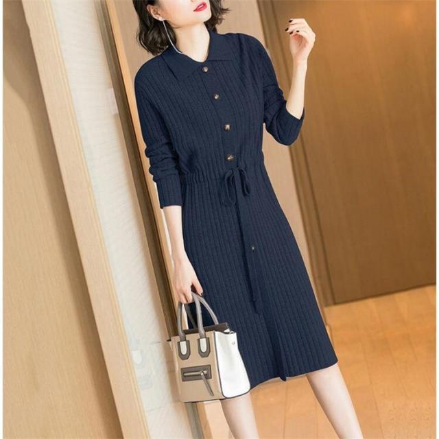 ウエストマークリボン角襟ワンピース 膝丈 ひざ丈 膝下 袖あり 長袖 襟付き 前開き ニット かわいい 大人可愛い きれいめ シンプル カジュアル 大人 上品 おしゃれ お洒落 かっこいい レトロ 大人可愛い 大人女子 こなれ感 ラブリー キュート ガーリー セクシー 主役級 存在感