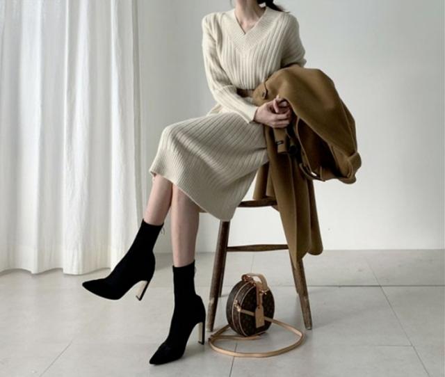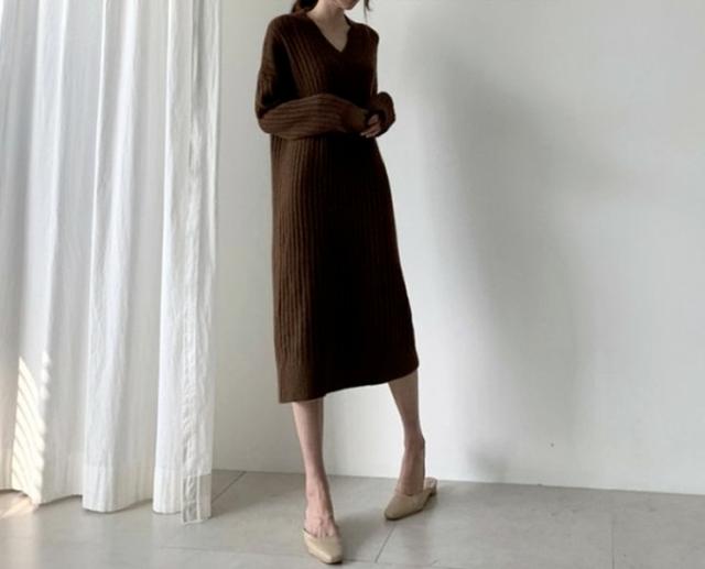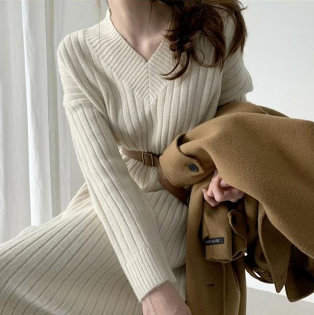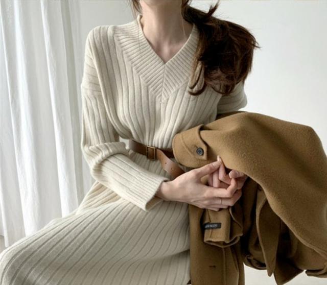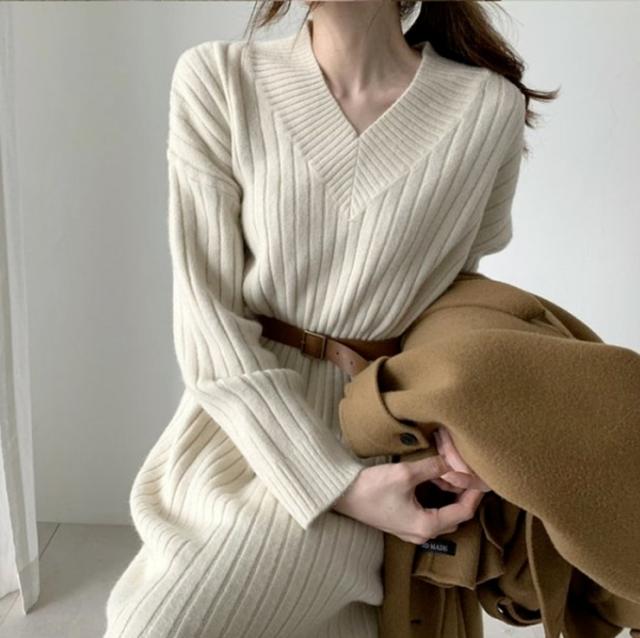 ワンピース ニットスカート ワンピドレス 膝下 ミモレ ミモレ丈 袖あり 長袖 Vネック 襟なし 細身 ストレート Iライン ニット かわいい 大人可愛い きれいめ シンプル カジュアル 大人 上品 大人女子 こなれ感 ラフ 秋 冬 10代 20代 30代 レディース 女性用 通勤 デート