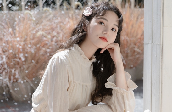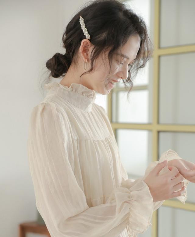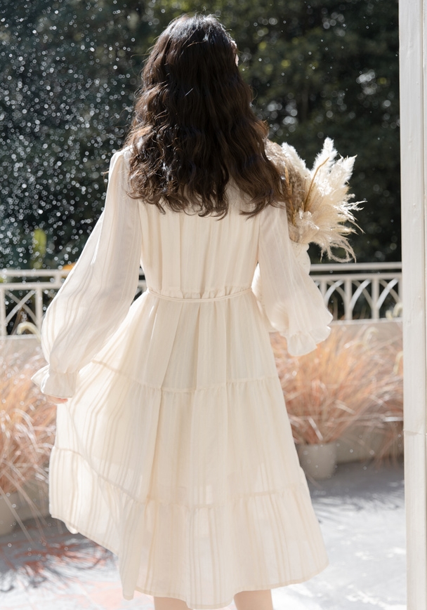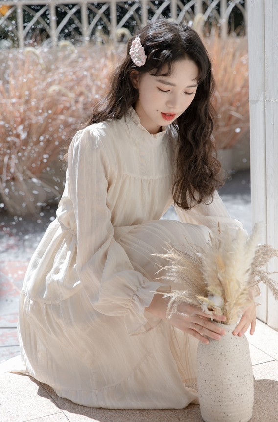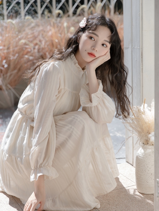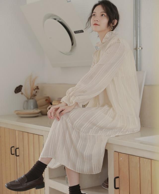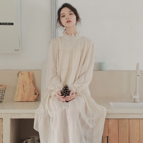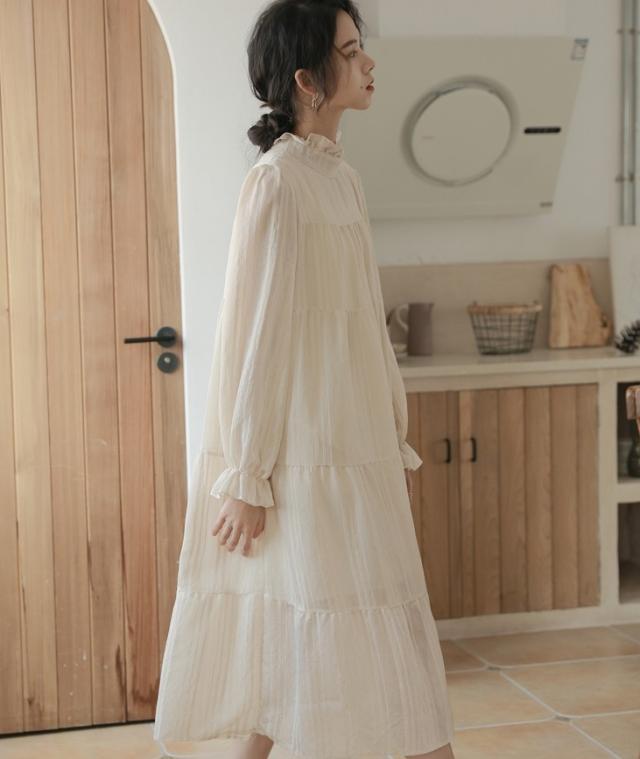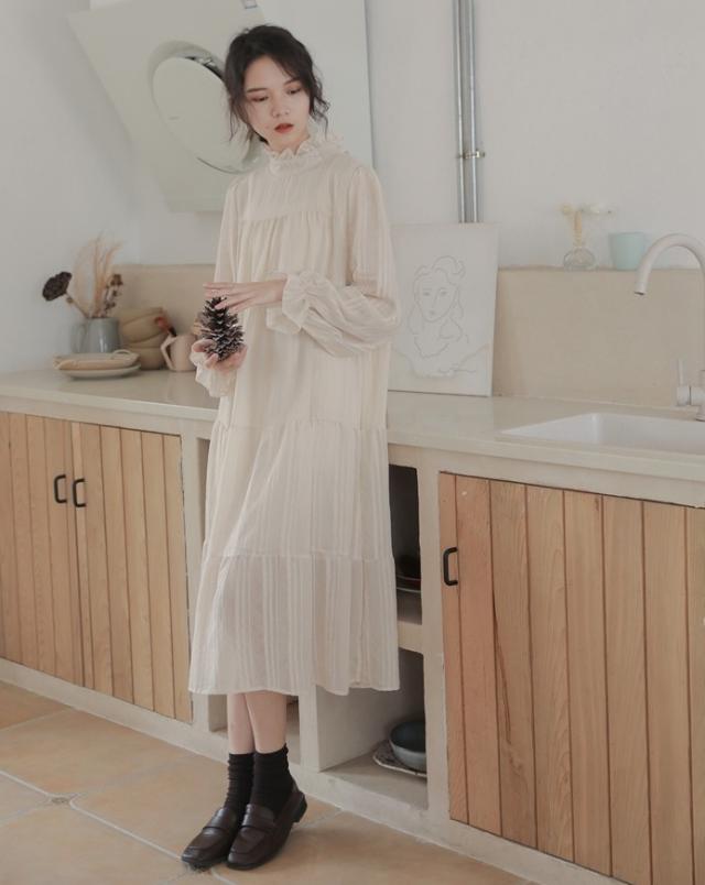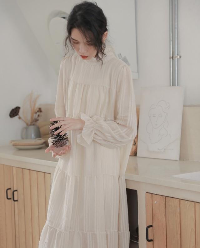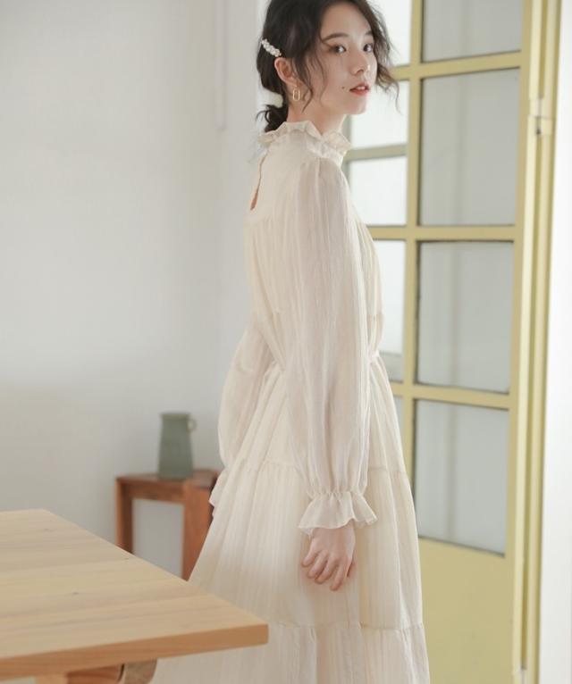 襟と袖部分が、くしゅっとした可愛らしいロングワンピース。